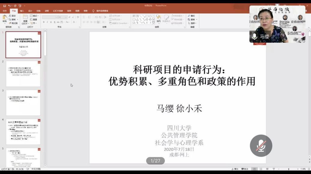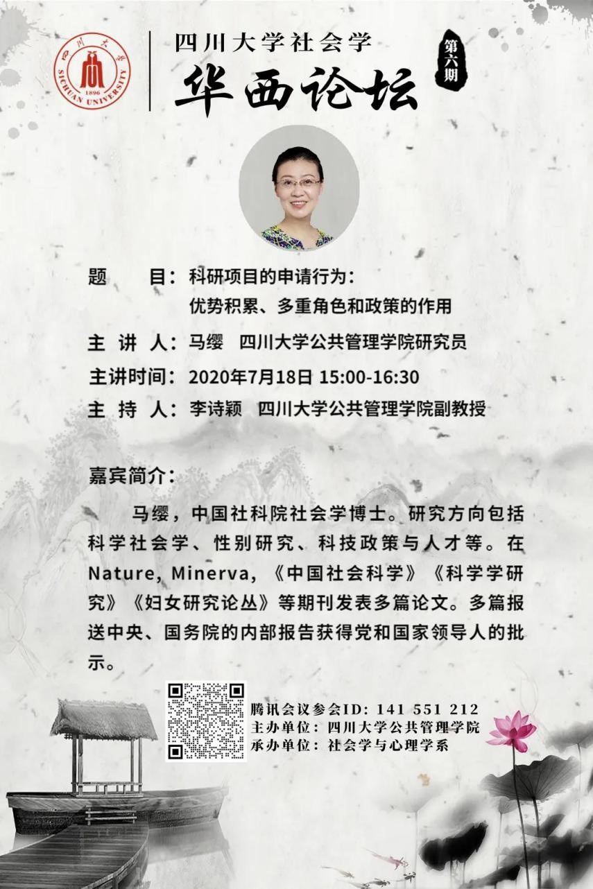 2020年7月18日下午15:00,澳门太阳成集团社会学华西论坛云系列讲座第六期于线上成功举行。澳门太阳成集团社会学与心理学系马缨研究员发表了题为“科研项目的申请行为:优势积累、多重角色和政策的作用”的精彩演讲。讲座由社会学与心理学系李诗颖副教授主持,百余名来自我校和省内外兄弟院校的师生参加了讲座。