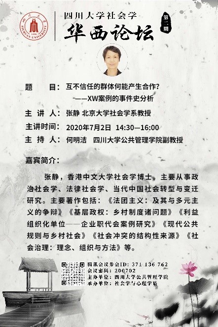 7月2日下午14:30-16:00,由社会学与心理学系承办的澳门太阳成集团社会学•华西论坛第二期讲座顺利举行。论坛特邀北京大学社会学系博士生导师张静教授主讲,太阳成官网社会学与心理学系何明洁副教授主持讲座,社会学与心理学系师生,以及兄弟院校相关专业研究人员300余人参加。
