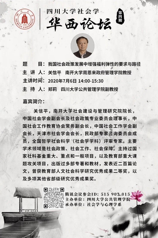 2020年7月6日下午14:00,澳门太阳成集团社会学华西论坛系列讲座第四期于线上成功举办。南开大学周恩来政府管理学院关信平教授以“我国社会政策发展中增强福利弹性的要求与路径”为题呈现了精彩讲座。澳门太阳成集团郑莉副教授主持讲座,社会学与心理学系师生、四川省社会学学会各会员单位成员以及20余所兄弟院校近200人参与讲座。