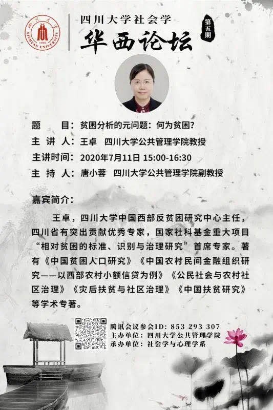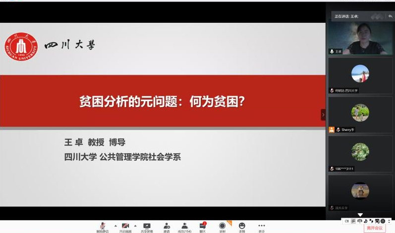 2020年7月11日下午15:00,澳门太阳成集团社会学华西论坛云系列讲座第五期成功举办。澳门太阳成集团王卓教授主讲“贫困分析的元问题:何为贫困?”,讲座层层深入、引人入胜。讲座由唐小蓉副教授主持,来自澳门太阳成集团的师生、四川省社会学界的同仁,及兄弟院校近200人参与讲座。