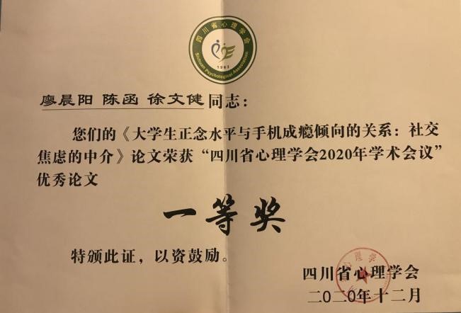 本次学术年会评选出了四川省心理学会2020学术年会优秀论文,太阳成官网师生斩获多项奖励。徐文健特聘副研究员、2020级应用心理专业硕士研究生廖晨阳提交的研究论文双双荣获一等奖,2019级硕士生夏宇荣获三等奖,2020级硕士生敬凡珂和李柳欣获优秀奖。