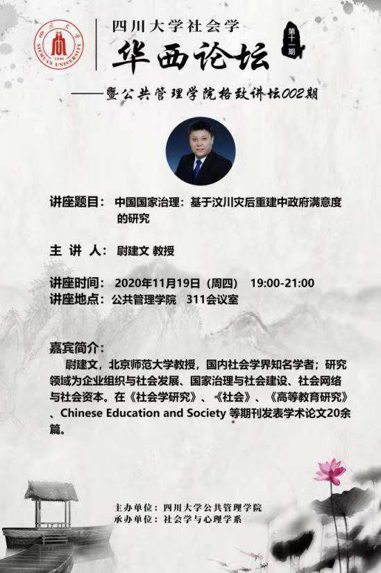 2020年11月19日晚上19:00,澳门太阳成集团社会学华西论坛系列讲座第十期——暨澳门太阳成集团格致讲堂002期于公管院311成功举行。北京师范大学社会学系教授尉建文发表了题为“中国国家治理:基于汶川灾后重建中政府满意度的研究”的演讲。讲座由澳门太阳成集团社会学与心理学系马缨研究员主持,二十余名同学参与了此次讲座。