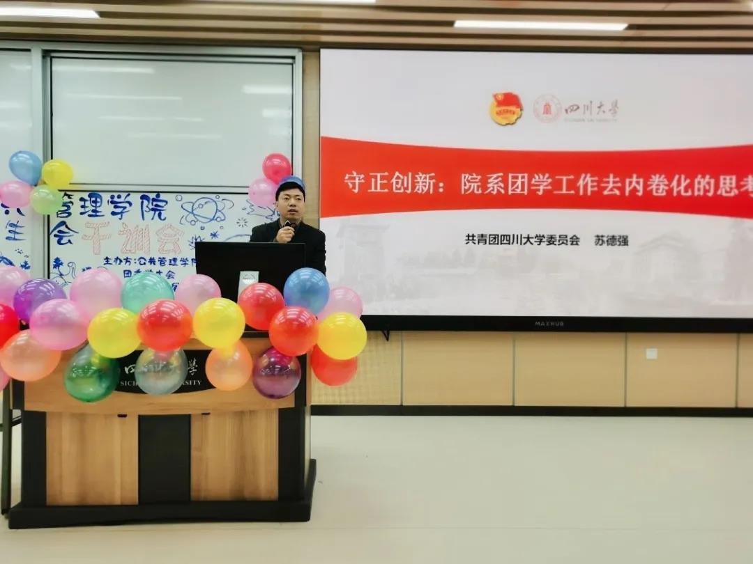 首先,苏德强老师以“守正创新:院系团学工作去内卷化的思考”为题为大家带来指导。苏老师指出了院系团学工作中存在的值得注意的倾向、阐释了“内卷”的概念与特点、点明了院系团学工作内卷化的典型特征,让全体参会人员对院系学生工作去内卷化有了更深的认识。苏老师在对澳门太阳成集团团学工作给予充分肯定的同时,激励全体成员在今后的学生工作中能更好的引领服务、锻炼自我,发扬学院特色,将学院团学工作推向更高的台阶。