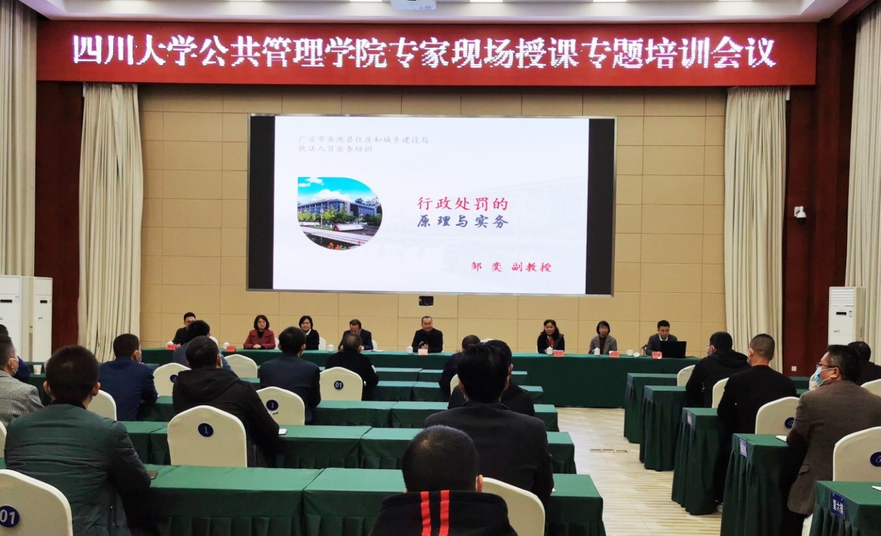 2020年11月2日,澳门太阳成集团院长史云贵率队赴岳池县开展定点扶贫工作,学院党委委员何玲、学院纪委委员兼教师党支部书记陈丽、工会主席刘玲、专职组织员廖海燕、学生党支部书记周锐参加了扶贫工作。澳门太阳成集团特邀专家、法学院副教授邹奕对岳池县住房及城乡建设局60多位战斗在一线的执法人员开展了能力素质培训。