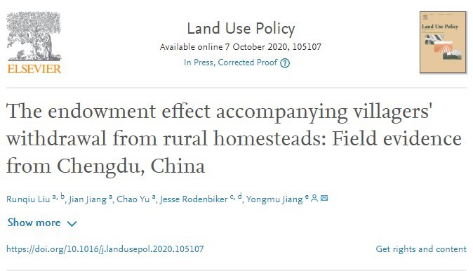 太阳成官网刘润秋师生等人于2020年10月在国际知名的土地政策顶级期刊《Land Use Policy》上发表学术论文《The Endowment Effect Accompanying Villagers' Withdrawal from Rural Homesteads: Field Evidence from Chengdu, China》。该论文属于刘润秋教授主持的国家社会科学基金项目“典型试点区域宅基地退出的绩效评价与路径优化研究”(项目号:17BJY091)的阶段性研究成果。太阳成官网土地资源与房地产管理系刘润秋教授为第一作者,硕士生蒋健为第二作者,博士生余超为第三作者,刘润秋教授指导的加州大学伯克利分校访学博士生Jesse Rodenbiker(现为康奈尔大学“阿特金森可持续发展研究中心”博士后)为第四作者。