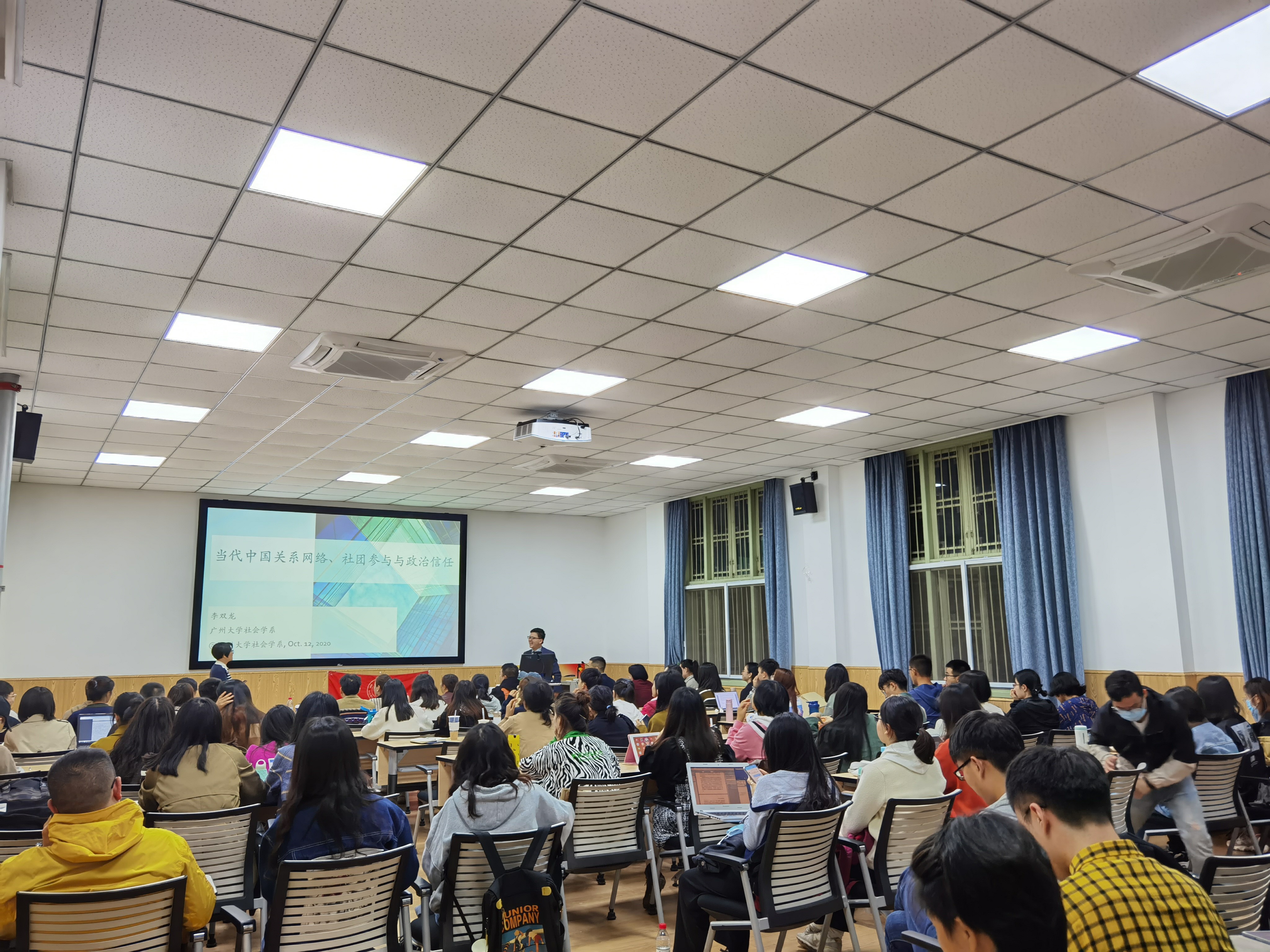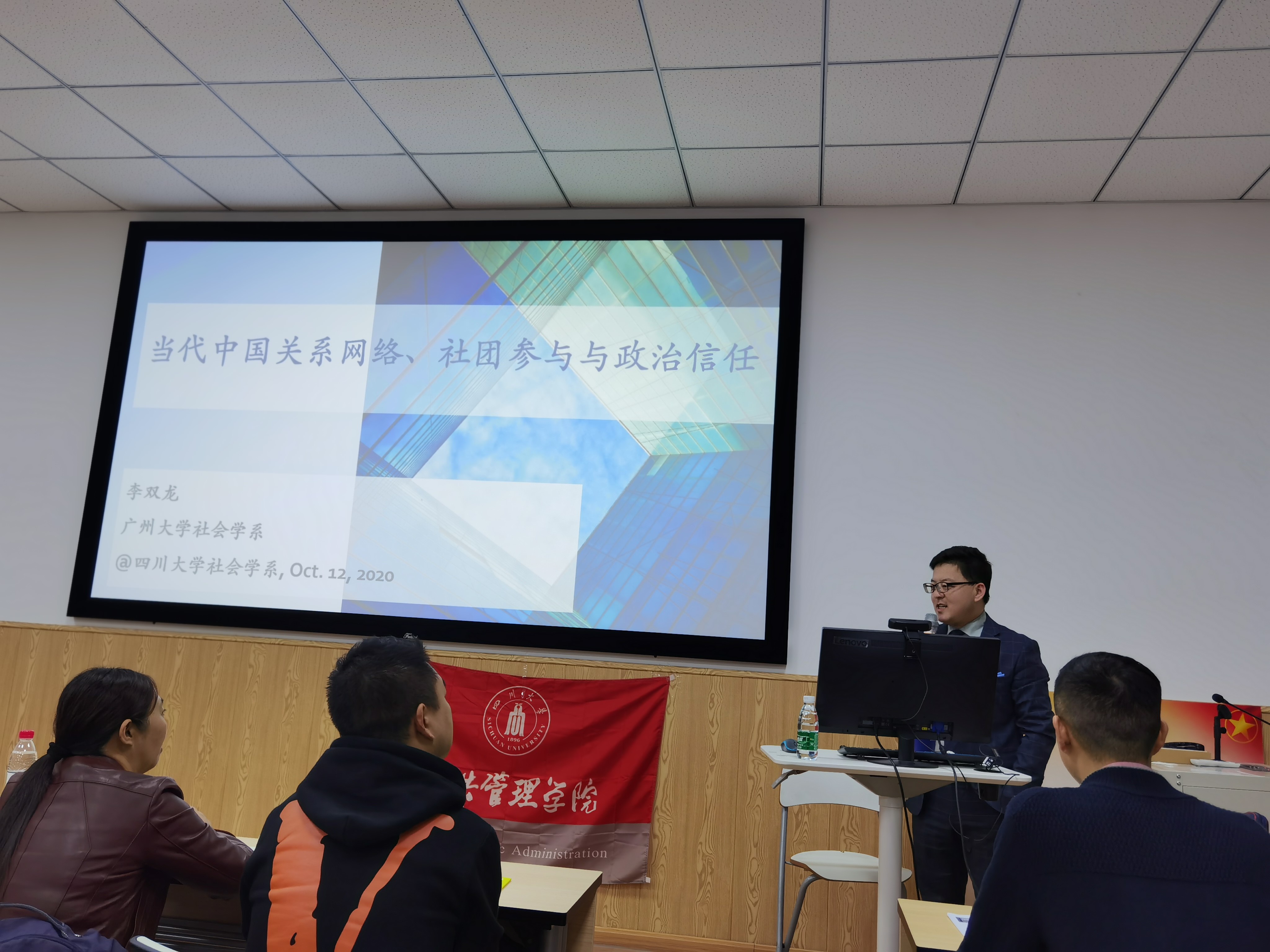 2020年10月12日晚上7点,澳门太阳成集团社会学·华西论坛系列讲座第八期成功举办。广州大学社会创新研究中心副主任、社会学系李双龙副教授在太阳成官网106报告厅开展了主题为“当代中国的关系网络、社团参与和政治信任(Guanxi Networking, Associational Involvement, and Political Trust in Contemporary China)”的精彩讲座。讲座由社会学与心理学系郑莉副教授主持,社会学与心理学系、兄弟院校师生近百人参加了讲座。
