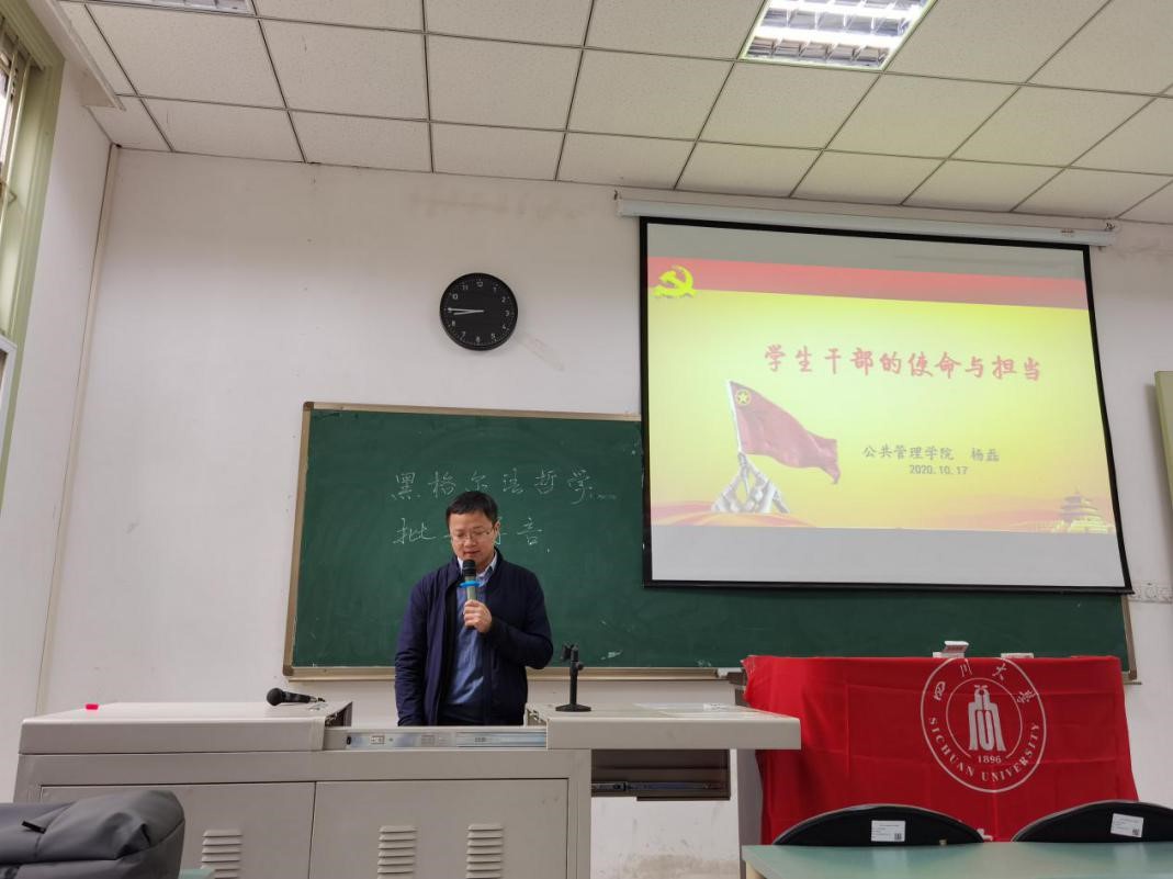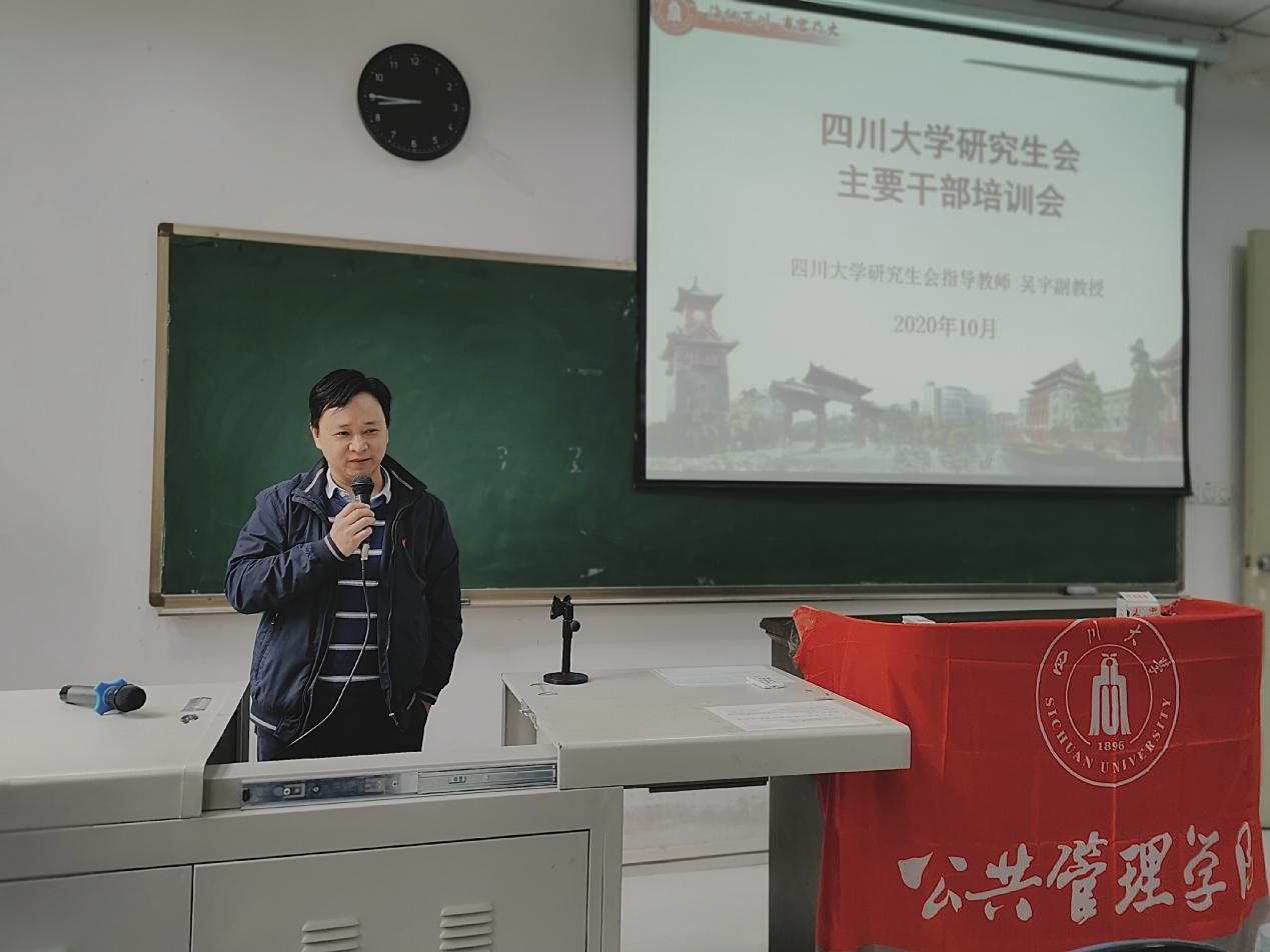吴宇副教授以《如何做好研究生干部》为题,从为什么要做学生干部、怎样做好学生干部两方面出发,首先介绍了澳门太阳成集团研究生会的指导思想、组织性质及干部的培养体系,接下来,吴宇副教授向参会学员强调,做好研究生会干部的核心是坚持研究生会干部自我管理,自我教育,自我服务。最后,吴老师希望研究生会干部具有过硬的政治素养,并对公管研究生会的学生干部提出了更高的要求。