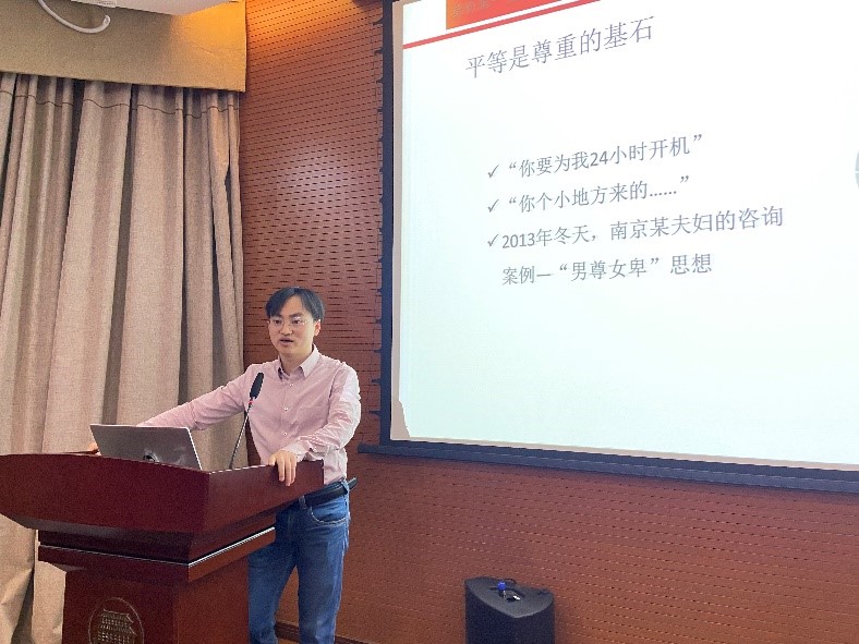 讲座伊始,刘老师介绍了本次讲座的背景,以12个典型的“你的伴侣对你说过的话或做过的事”作为引入,展开了本次精彩的讲座。首先,以“举案齐眉”等三个小故事引出尊重是一切积极社交关系的起点,也是爱的第一要义,要会爱人,就要先学会尊重人。