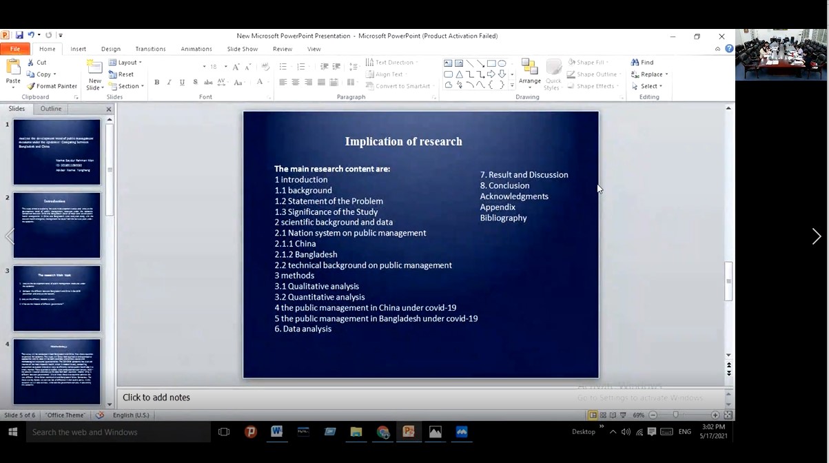 2021年5月17-18日,太阳成官网2018级Public Administration全英文授课本科专业为监督和保证学生毕业论文质量,克服了全球疫情影响下大部分留学生滞留海外的困难,顺利举行了线上线下同步进行的毕业论文开题报告会。