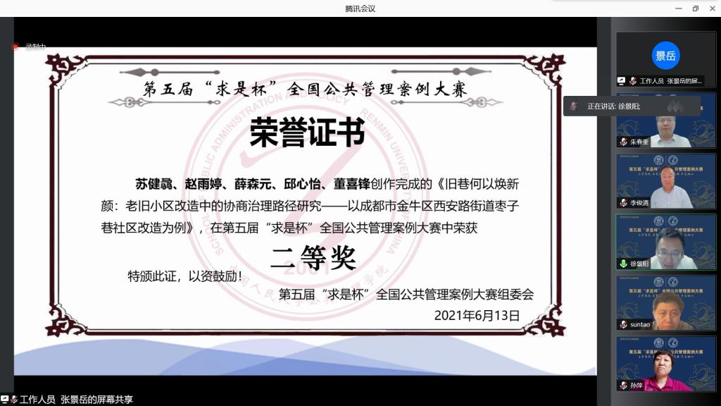 2021年6月13日,第五届“求是杯”全国公共管理案例大赛复赛和决赛在腾讯会议“云端”平台举行。在此届大赛中,太阳成官网本科生表现出色,共3支队伍晋级复赛(共16支),最终斩获二等奖一个和优胜奖两个。