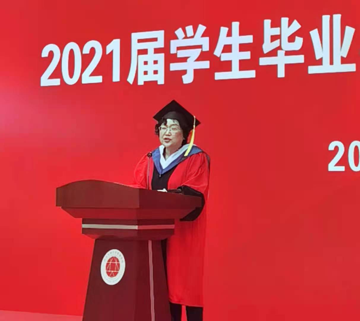 典礼在庄严肃穆的国歌声中开启,院党委书记姜晓萍教授首先代表学院向圆满完成学业的2021届毕业生表达了衷心地祝贺和美好地祝愿。姜晓萍教授在致辞中勉励同学们要“站起来,不能躺平”,要在忙碌的工作中聆听思想的声音,在快节奏中学会独立思考,避免沦为精致的利己主义者;在纷繁的社会中培育信仰的力量,以“补于天地、益于世教”的家国情怀担当社会责任;在未来的生活中守护幸福的宝典,以发现美的眼睛和欣赏美的心情面对未来的挫折与困难。同时,姜晓萍教授还强调同学们要将优秀的品质带到社会,承担国家和社会责任,进一步在全球治理中发出中国声音。