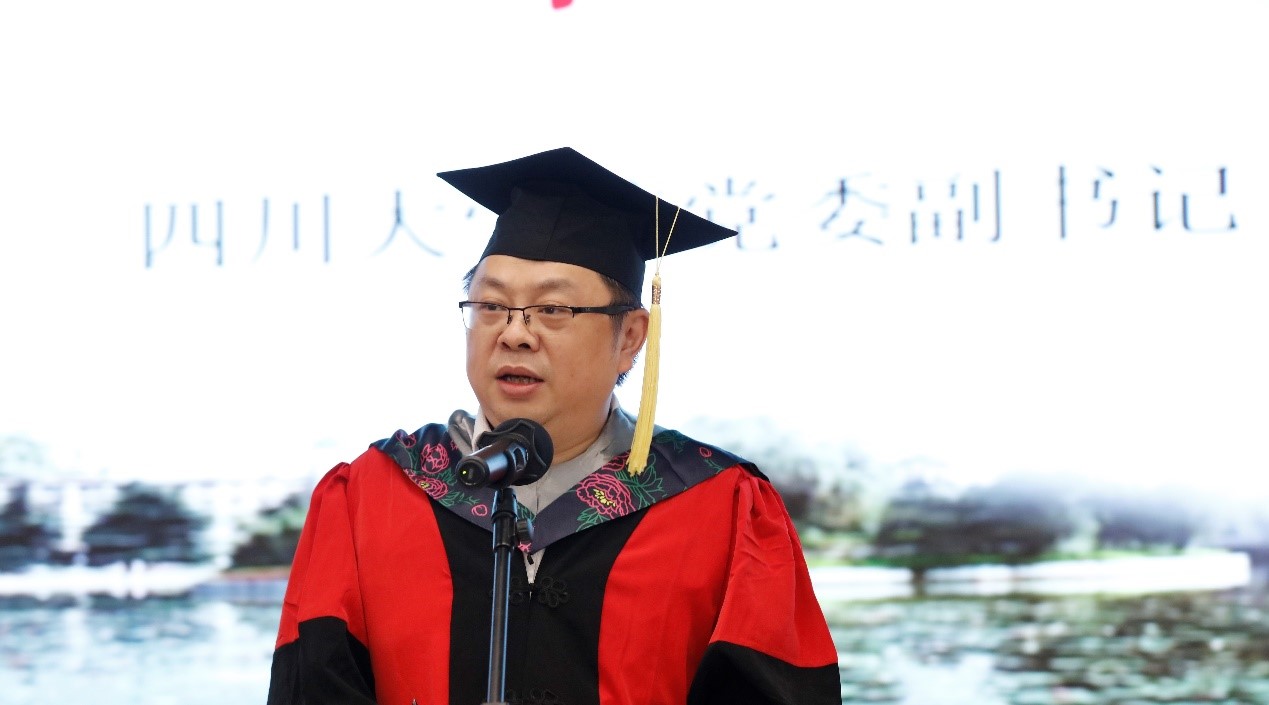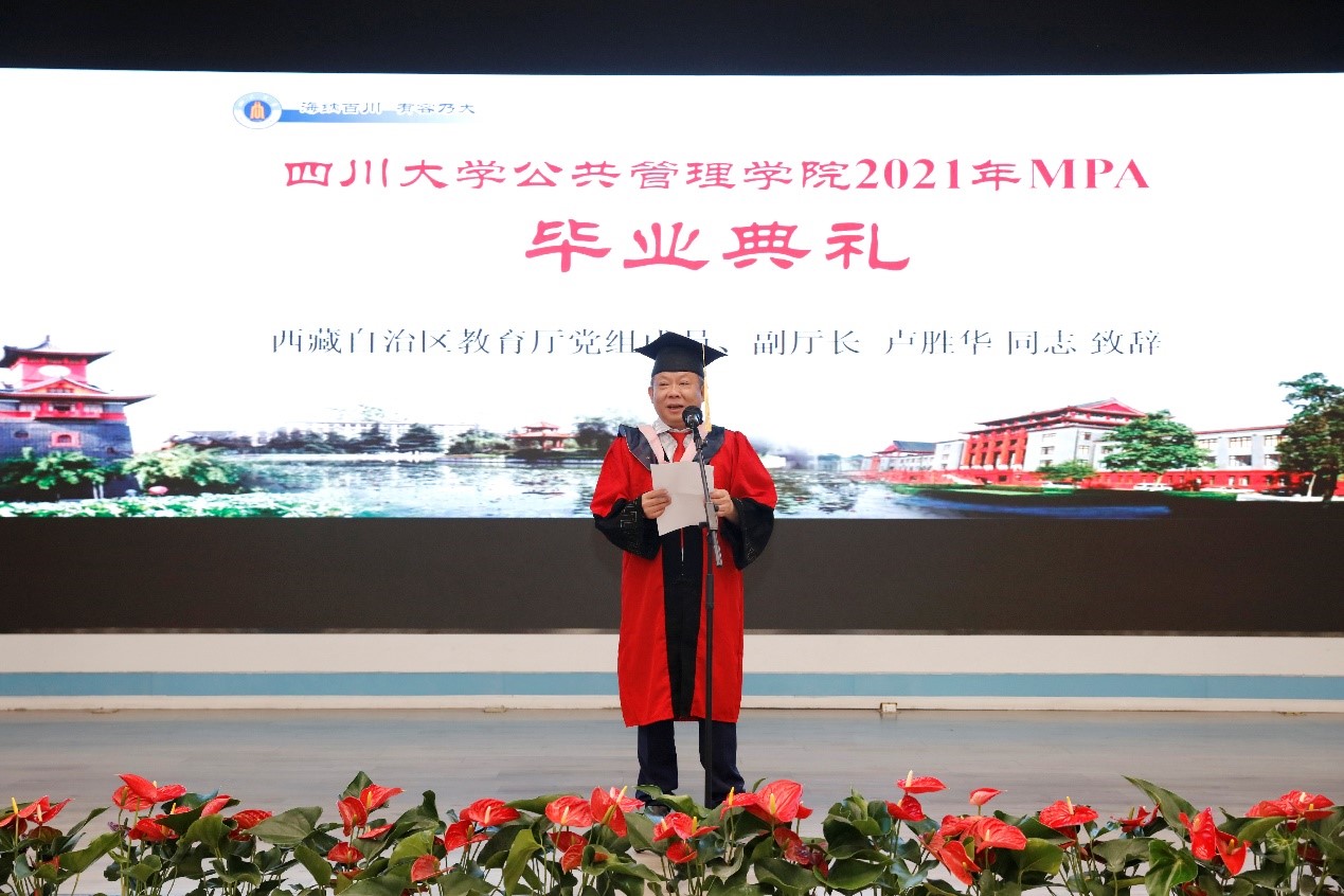 毕业典礼在庄严肃穆的国歌声中拉开帷幕。澳门太阳成集团党委副书记郭勇教授代表学校向全体圆满完成学业的毕业生表达了热烈的祝贺,并对学校MPA合作培养单位四川省纪委监委、西藏自治区组织部、教育厅表示衷心感谢。郭勇教授在致辞中给毕业生们提出了几点期许:一是传承川大的红色文化,追随江姐、杨闇等革命先辈的步伐,传承中国共产党伟大的革命精神;二是弘扬好川大的学术传统,谨记“海纳百川,有容乃大”的校训和“严谨、勤奋、求是、创新”的校风,努力汲取新知识,创新观念;三是光大公共管理的专业精神,弘扬 “公成天下,大道为学”的教育理念,身体力行,为推进国家善治、增进人民福祉贡献力量;四是要做一名党和人民的好干部,不忘初心,以更高更严的标准要求自己。