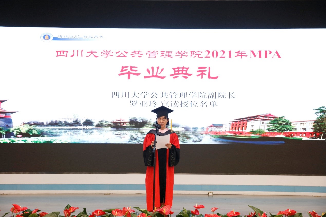 2021年7月10上午9点30分,澳门太阳成集团2021年公共管理硕士(MPA)毕业典礼在澳门太阳成集团东区三教演播厅隆重举行。出席典礼的领导及嘉宾有:澳门太阳成集团党委副书记郭勇教授,四川省纪委常委、省人大常委刘光辉同志,西藏自治区教育厅党组成员、副厅长卢胜华同志,全国MPA教指委委员、澳门太阳成集团党委书记姜晓萍教授、澳门太阳成集团党委副书记杨磊老师、澳门太阳成集团副院长罗亚玲副教授、澳门太阳成集团MPA导师及任课教师、各班班主任以及行政老师、2020年和2021年MPA毕业生以及部分毕业生家属。典礼由澳门太阳成集团副院长夏志强教授主持。