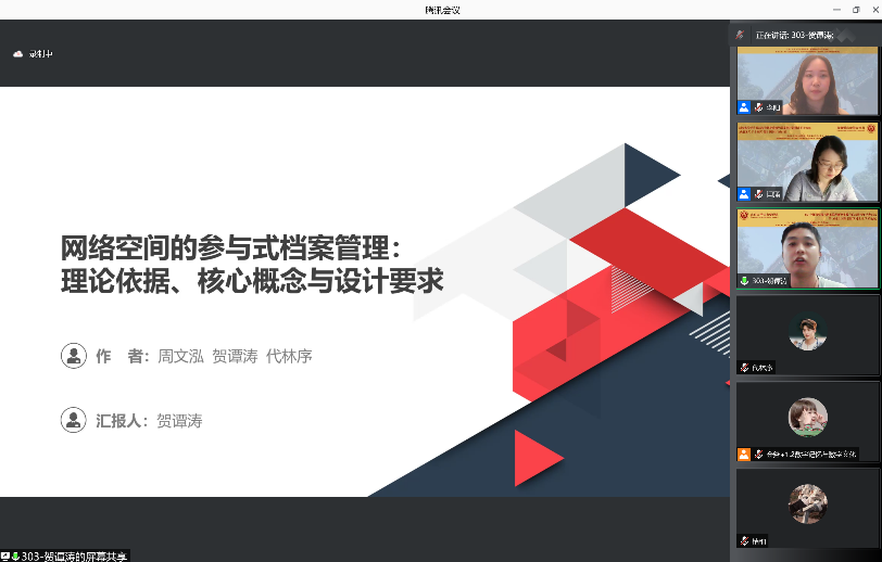 26日上午,论坛继续进行。周文泓副教授携贺谭涛在分会场“数字记忆与数字人文”做题为《建构进程与展望:计算档案学的发展研究》的学术报告。该研究对现阶段计算档案学的理论和实践进展进行了系统梳理,从主体、对象和管理活动三个维度对实践案例进行特征归纳,并结合我国新文科建设背景提出了计算档案学的后续建构空间。随后在该分会场的“档案资源开发与利用”主题下,周文泓副教授作为主持人,有效控制会场节奏,积极引导与会者参与讨论,保证了会议高效、有序地进行。