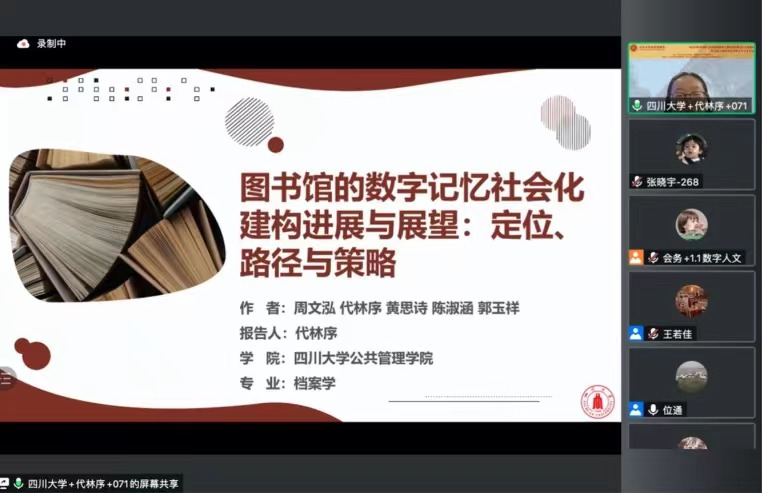 2021年9月25日至26日,由北京大学信息管理系、图情档39青年学者沙龙主办的2021年图书情报与档案管理研究生教育论坛暨青年学者论坛、第十四届全国图书馆学博士生论坛顺利召开。本次论坛采用线上为主、线上和线下结合的方式,来自全国高校、档案馆、图书馆等的数百名专家、学者参会,共同探讨图情档专业的人才教育、学科发展及前沿议题。秘书档案学系周文泓副教授应邀担任分会场“数字记忆与数字人文”主持人,2020、2021级档案学研究生代林序、张晓宇、2018级本科生贺谭涛应邀参会,并在“数字记忆与数字人文”、“图情档人才培养与学科发展”等分会场做主题发言。