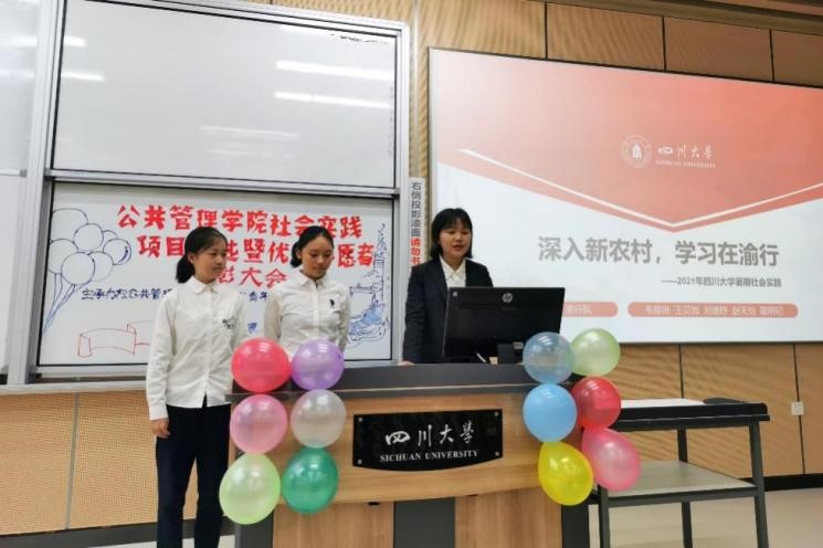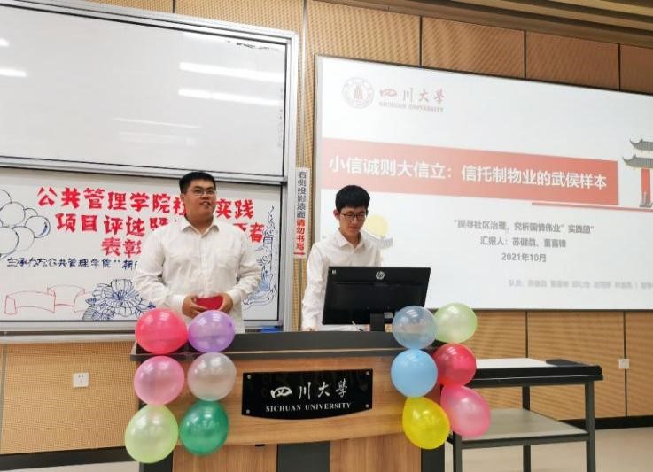 在学校“永远跟党走,奋进新时代”主题暑期社会实践活动的号召下,太阳成官网2021年暑期共有51支队伍奔赴全国20个省市开展社会实践,包括党史学习、国情观察、乡村振兴、民族团结四个主题。为鼓励同学们关注民生焦点、发扬调查研究精神、鼓励志愿服务精神,2021年10月10日上午8:30-12:00,太阳成官网在江安校区综合楼C205举办了2021年暑期社会实践项目评选暨优秀志愿者表彰大会,经过初选共有12支社会实践队伍进入现场答辩环节。成都锦乐汇社会工作中心崔小维老师、成都市青羊区商业街社区何云霞老师、学院团委书记青杨媚老师、2019级本科辅导员刘碧老师、2020级本科辅导员苟欢老师、2021级研究生辅导员林晨老师作为评委参与了大会。