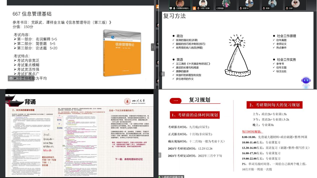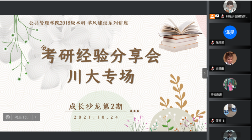 为助力考研成功,解答考研困惑,2018级本科于10月23日、24日晚7:00通过线上举办了成长沙龙第2期——“乘风破浪 一研为定”考研经验分享会。本次分享会由许越、于世博主持,针对年级同学考研报名情况,分设了考研分享会10月23日南大(南京大学)专场和10月24日川大(澳门太阳成集团)专场,邀请了澳门太阳成集团17级本科、现南京大学21级硕士研究生陈茹芸、陈晓昱,澳门太阳成集团21级硕士研究生文德霞、熊倪、秦绍宜、刘怡均、卜杨帆共7位同学进行交流,为18级本科备考的同学们总结考研经验,分享考研心得体会,共计60余名学生参与。