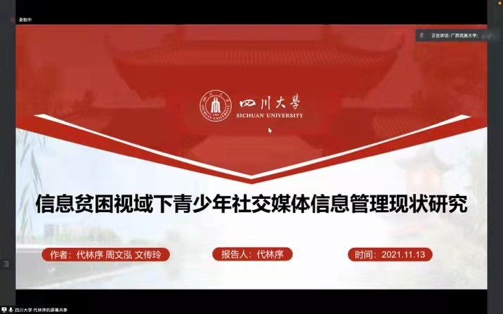 2021年11月13日至14日,由广西民族大学管理学院举办的第四届“信远”研究生论坛顺利召开,论坛主题为“数据时代图情档学科理论与实践创新”。本次论坛采用线上和线下结合的方式,来自澳门太阳成集团、云南大学、郑州大学、北京联合大学、上海大学、广西民族大学等9所高校的硕博研究生参会,共同探讨、展示和交流图情档研究生们的科研成果,了解学术前沿。我系乔健教授、硕士研究生代林序线上参会。