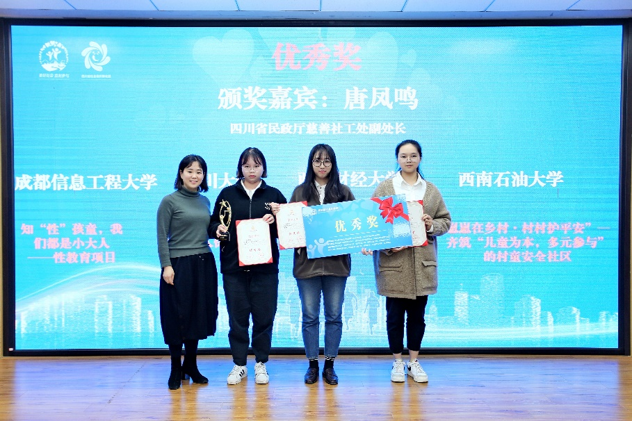 我校的三支参赛队伍成员分别来自社会学、心理学、社会工作等不同专业,覆盖本科生、研究生的不同年级。同学们在决赛现场展现了川大学子服务社会、立足民生的专业视角,求真务实、科学严谨的专业作风。最终,由2019级社会工作本科陈紫萱、邓杰、谢圆圆三名成员组成的追光者队挺进大赛前十,荣获“优秀项目奖”,徐婷副教授获评“优秀指导教师”,我校同时荣获大赛“优秀组织奖”。