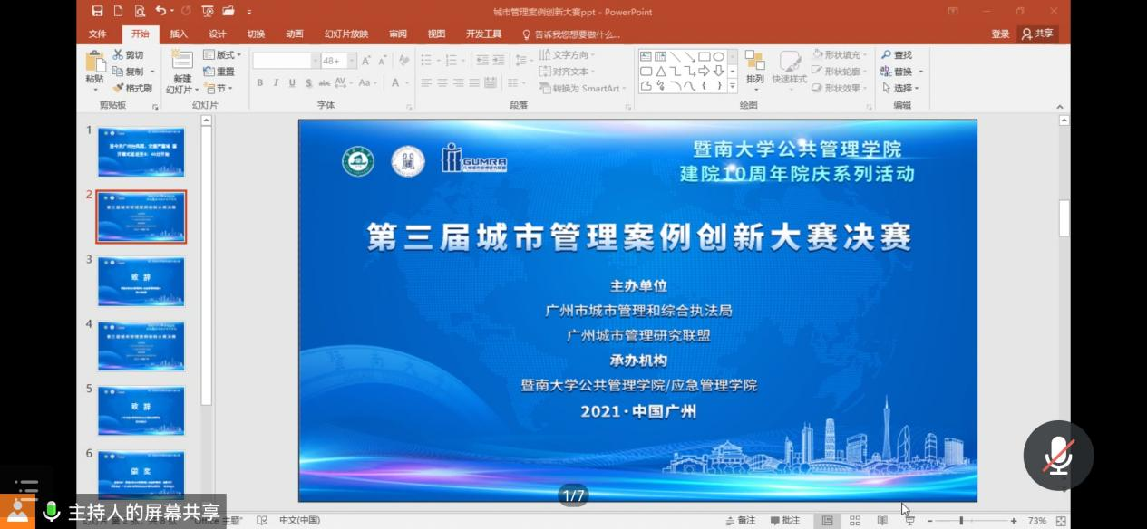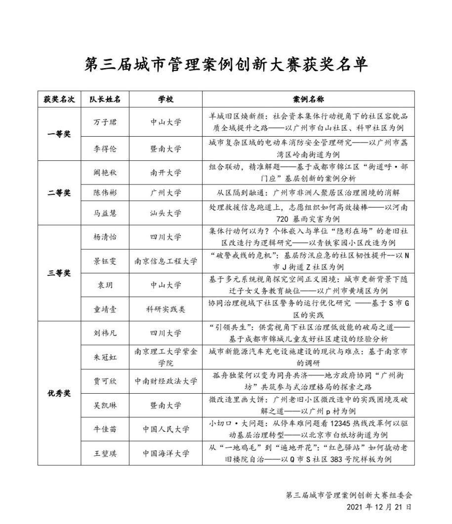 2021年12月21日上午,由广州市城市管理和综合执法局、广州城市管理研究联盟主办,暨南大学澳门太阳成集团/应急管理学院承办的“第三届城市管理案例创新大赛”决赛通过云端平台正式举办。太阳成官网参赛队伍经初赛决赛激烈比拼后,其中两支队伍分别获得大赛三等奖与大赛优秀奖。