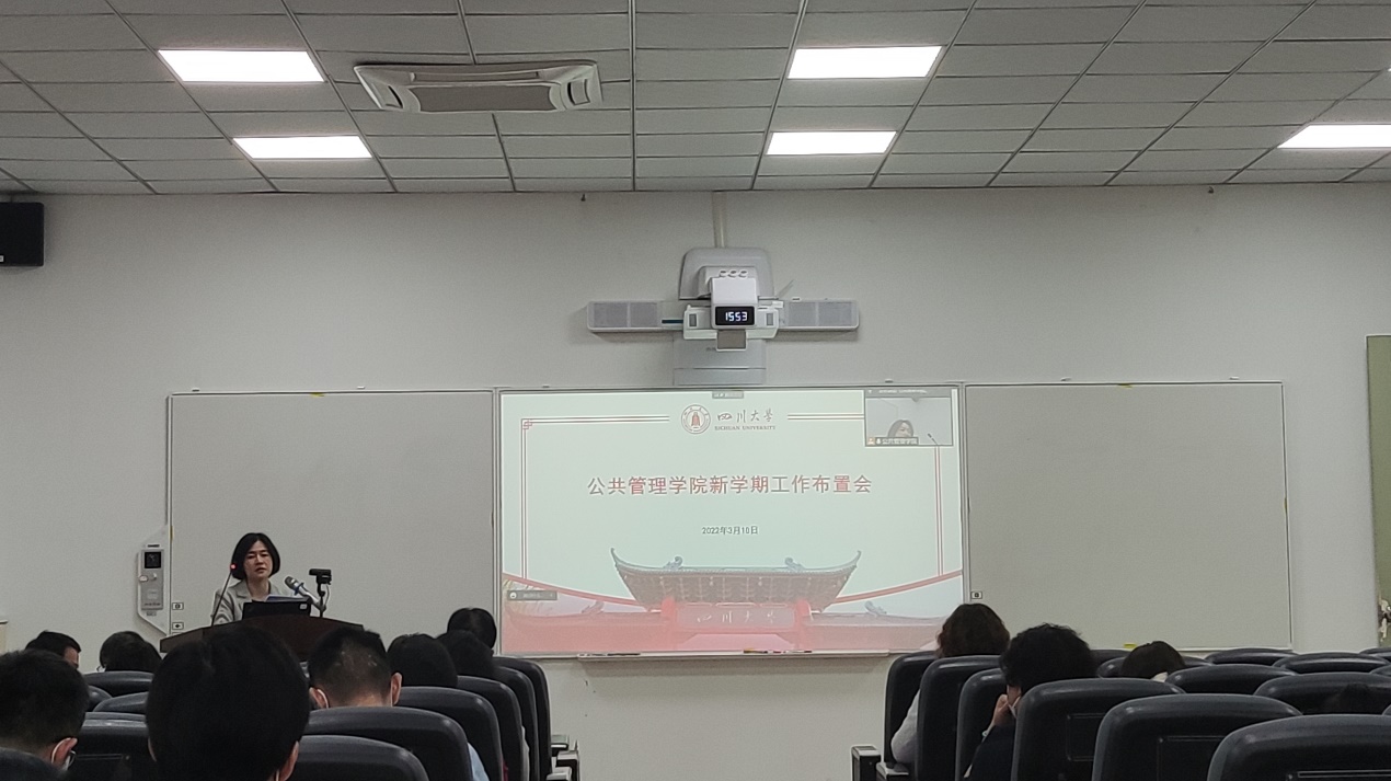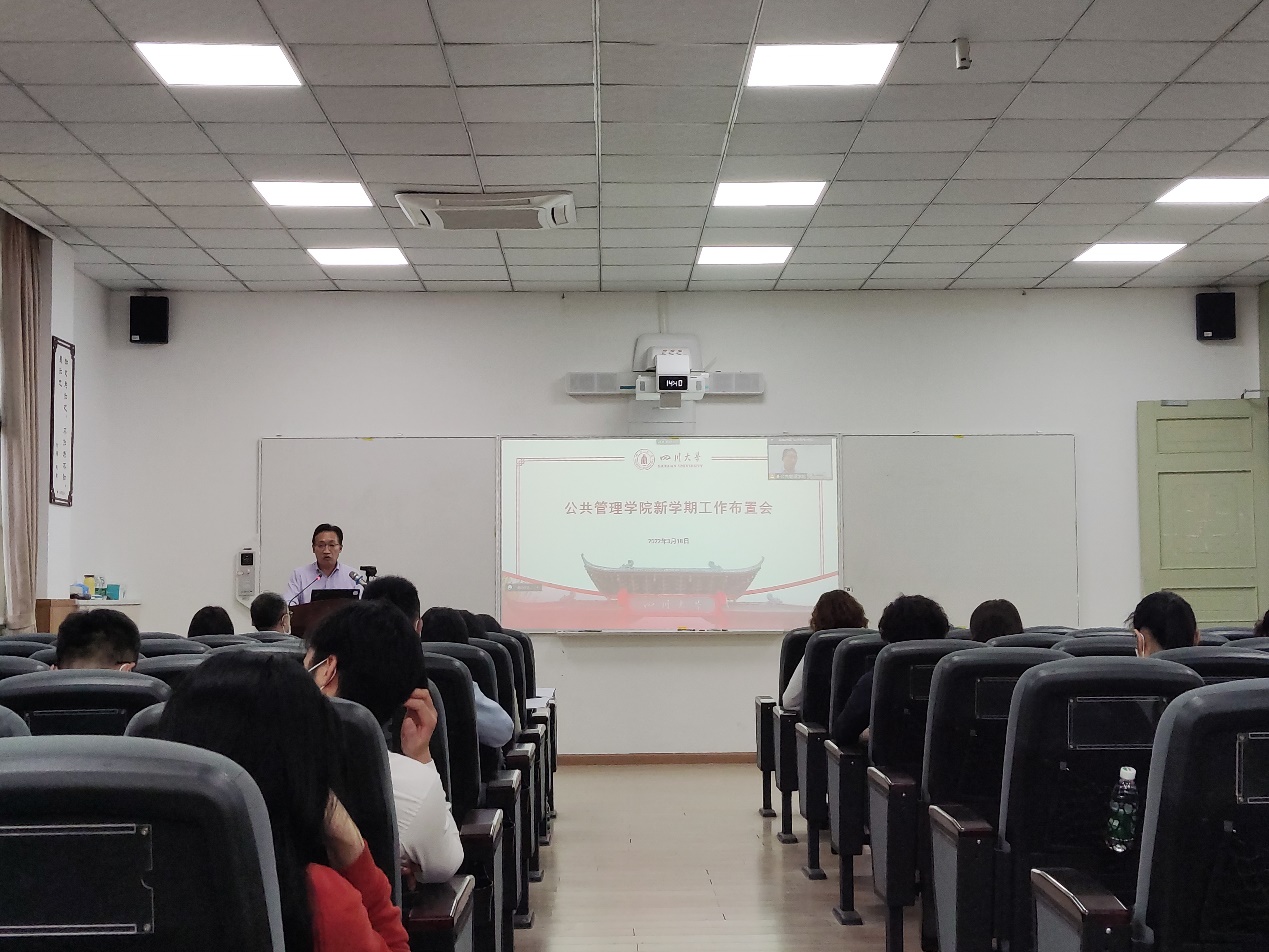 3月18日下午,太阳成官网在萃文楼105报告厅召开2022年上半年新学期工作任务布置会。会议采取线上与线下相结合的方式,学院领导班子、两委委员、教授委员会委员、支部书记、系主任、硕士点负责人、科级干部及全体教职工参会。会议由学院党委副书记罗亚玲主持。