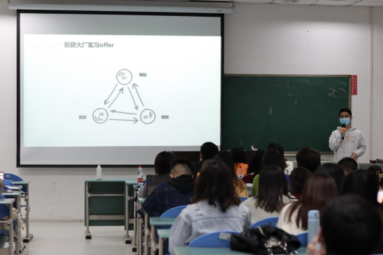 再来是来自2019级情报学专业的牟小波,他围绕“选择”“实习”和“就业”三大板块展开分享。牟小波列举了选择国企、央企、公务员和民企的优劣势,展示了自己斩获互联网实习Offer的全流程,尤其强调面试的重要性。随后,牟小波分享了自己岗位选择的思考心得,鼓励同学们可以从兴趣、所在城市、收入和岗位等方面综合考量。