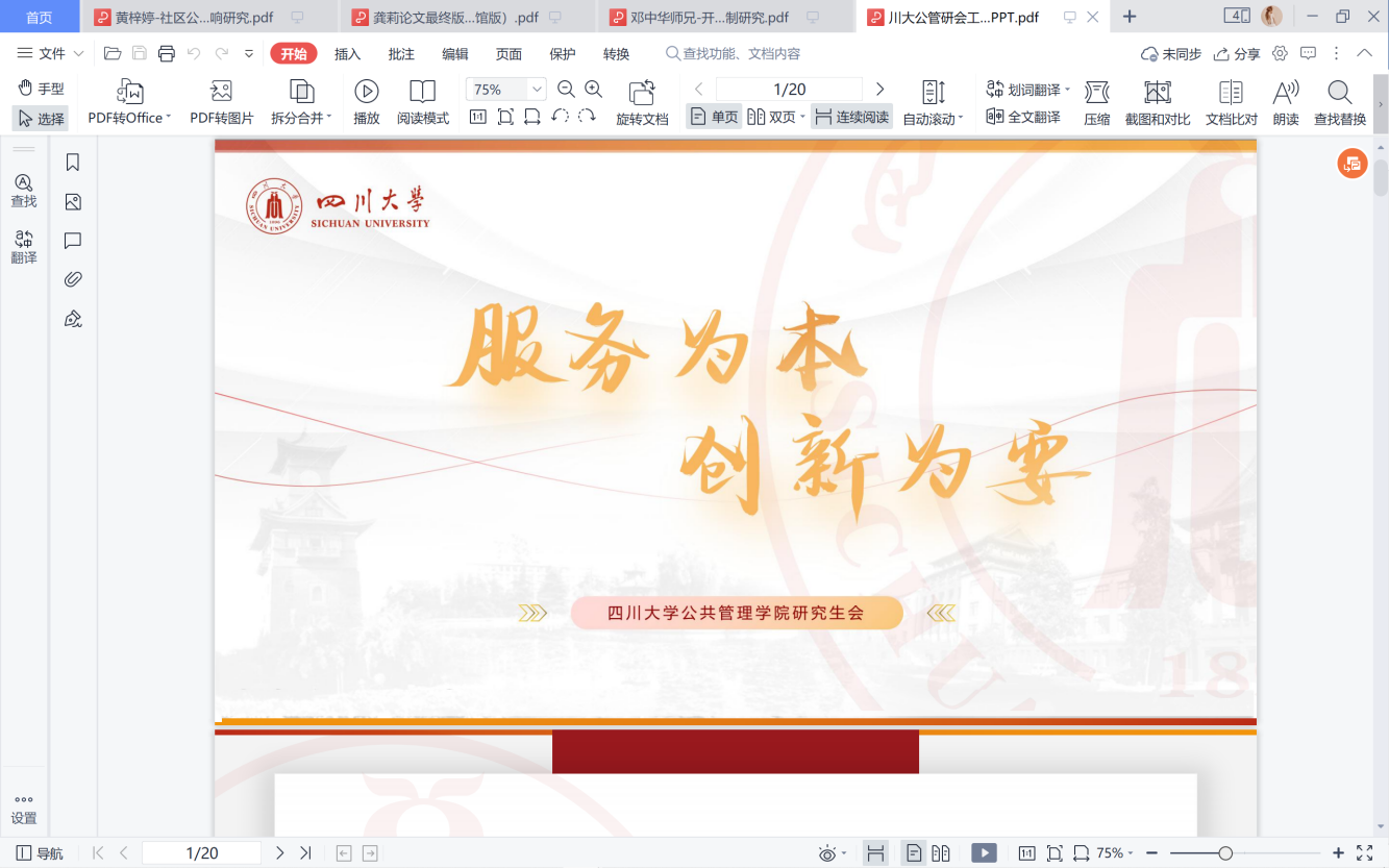 首先,各校公管学院研究生会交流了工作成效与经验。太阳成官网研究生会主席侯捷同学以“服务为本、创新为要”为主题,从太阳成官网研究生会的组织架构、部门建设、干部能力提升等方面介绍,并以“思想引领”、“钻研崇学”、“强化实践”、“文体兼荣”四个维度开展工作回顾与经验总结。目前,太阳成官网研究生会已连续9年获评“澳门太阳成集团十佳研分会”,并于2020年获评“成都市优秀研究生分会”。澳门太阳成集团团委于今年荣获 “四川省五四红旗团委”称号。各校公管学院研究生会在分享中学习,在交流中进步,真正实现了共话发展、共创佳绩。