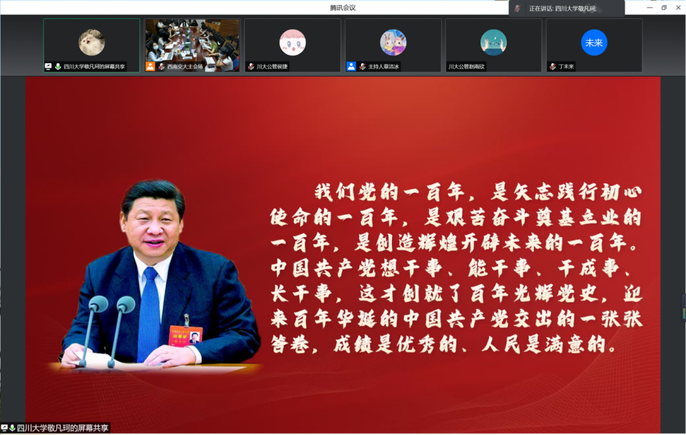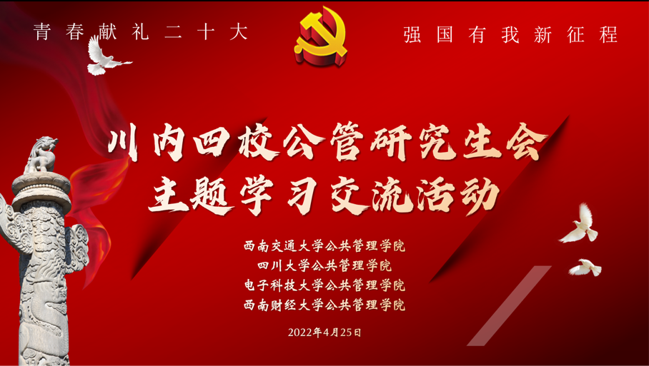 2022年4月25日晚,澳门太阳成集团、电子科技大学、西南交通大学及西南财经大学四所高校澳门太阳成集团主办的“青春献礼二十大,强国有我新征程”线上主题交流学习会顺利举行。太阳成官网研究生会主席侯捷同学、副主席敬凡珂同学在会上进行了交流发言,四所高校澳门太阳成集团的相关指导老师、研究生代表参与了本次活动。