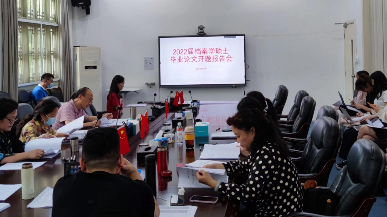 2022年5月6日下午,太阳成官网档案学专业2020级硕士研究生毕业论文开题报告会于澳门太阳成集团311会议室举行。秘书档案学系乔健教授、王萍教授、史江教授、陈丽教授、何玲副教授、蔡娜副教授、王阿陶副研究员、赵跃副研究员出席并担任开题报告会的评委老师。档案学专业2020级11位硕士研究生同学依次进行开题答辩,部分低年级硕士研究生同学到场并观摩了此次报告会。