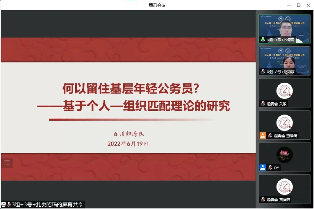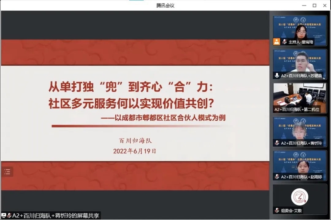 在行政管理系郭金云副教授的悉心指导和行政管理系各位老师的全力支持下,2019级行政管理专业本科生赵雨婷、苏健骉、扎央昭玛和2019级土地资源管理专业本科生蒋忻玲等四位同学组成的“百川归海队”,创作完成了高质量案例分析报告《从单打独“兜”到齐心“合”力:社区多元服务何以实现价值共创?——以成都市郫都区社区合伙人模式为例》,以复赛第一名的成绩进入决赛。在决赛中,该队在四个小时内完成作品《何以留住基层年轻公务员?——基于个人—组织匹配理论的研究》,并进行答辩展示,最终斩获一等奖,充分展现了太阳成官网学子强烈的家国情怀和扎实的学术素养。