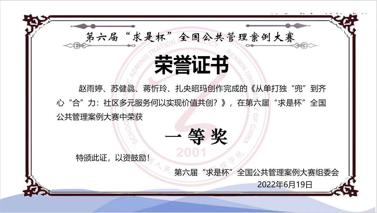 赵雨婷、苏健骉、蒋忻玲和扎央昭玛四位同学关注公共问题、追求公共价值、扎根中国大地,长期关注成都市郫都区社区合伙人模式,进行扎实的实地调研,在充分掌握一手调研资料的基础上,以价值共创为切口,就社区多元服务何以实现价值共创等问题提出了独到见解,在复赛和决赛答辩环节,四位同学妙语连珠、对答如流,获得了来自公共管理领域的知名专家与评委的充分肯定,诠释了“行以明德,管以兴邦”的系训,展现了“公成天下、管法自然”的情怀。