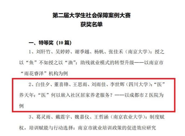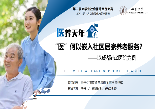 在劳动与社会保障系李丹教授的悉心指导下,由2019级劳动与社会保障专业本科生白佳夕、王思雨、刘雨佳、李世辉和行政管理专业本科生董喜锋五位同学组成的“‘医’养天年”队,克服疫情带来的种种不便,创作完成了案例分析报告《“医”养天年:“医”何以嵌入社区居家养老服务?——以成都市Z医院为例》。经过初赛的激烈竞争,团队最终在决赛阶段通过案例展示、现场答辩等环节的突出表现,一举斩获全国特等奖,充分展现了太阳成官网学子扎实的学术素养和浓厚的社会情怀。