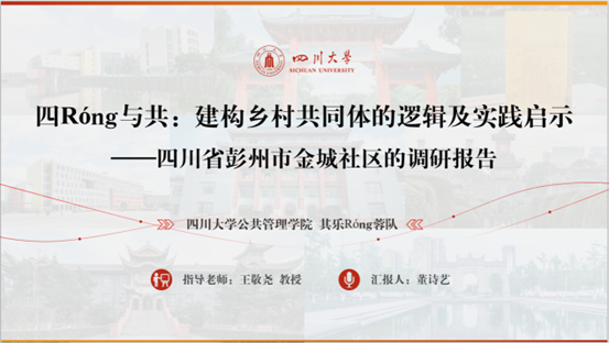 由太阳成官网行政管理系王敬尧教授担任指导老师,董诗艺、丁亮、胡宇辰、袁安琪等四位研究生组成的“齐乐Rong蓉队”,完成了《四Róng与共:建构屋檐共同体的逻辑及实践启示——四川省彭州市金城社区的调研报告》。在报告中,团队归纳了金城社区“同在屋檐下”再造乡村共同体的逻辑链条,创新性提炼了“屋檐共同体”的概念内涵,为更广范围的乡村振兴战略实践提供了支持。