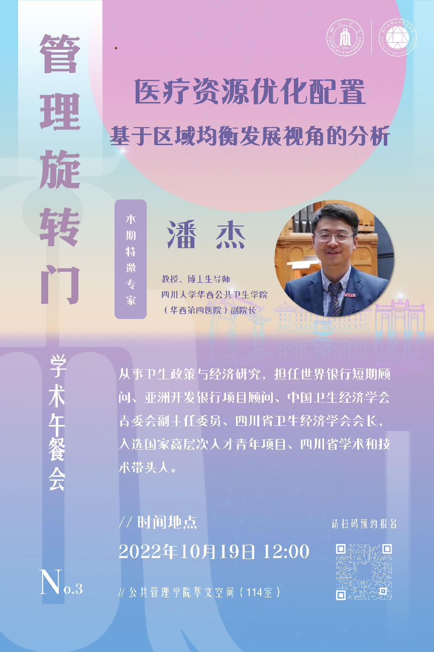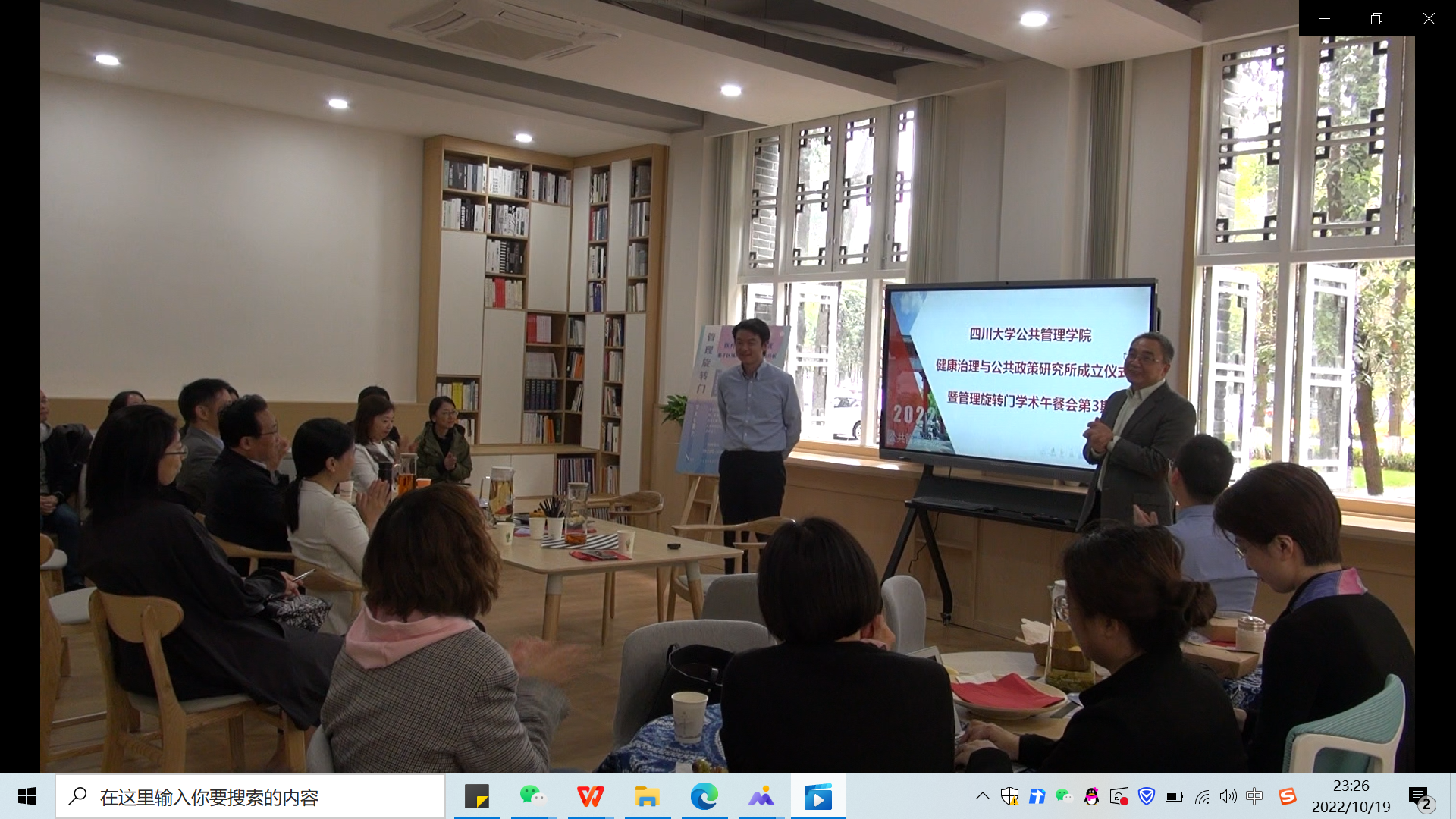 2022年10月19日,澳门太阳成集团健康治理与公共政策研究所成立仪式和第3期“管理旋转门”学术沙龙在学院共享空间(萃文空间)举行。本次活动特邀华西公共卫生学院(华西第四医院)副院长、博士生导师潘杰教授作为主讲嘉宾,学院各系老师积极参加了此次学术活动。