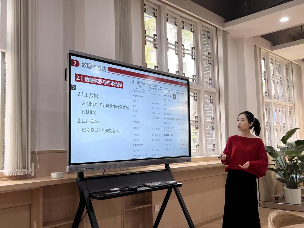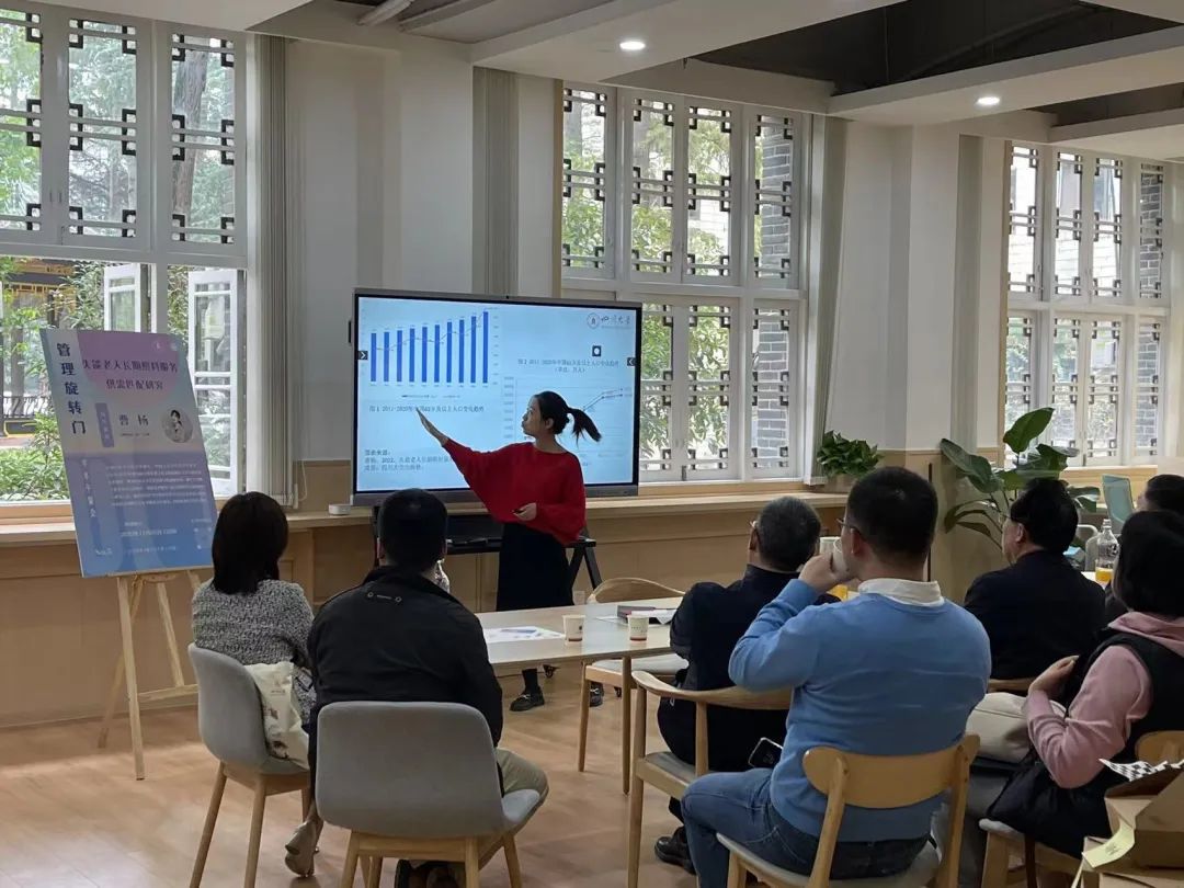 分享会伊始,主持人劳动与社会保障系的林熙老师简要介绍了曹杨老师的研究方向与学术传承。曹杨老师主要从事人口老龄化、健康养老服务与社会保障等方面的教学与研究工作。近四年,曹杨老师深耕于长期照料领域,并形成了一系列阶段性成果。借助此次学术沙龙的机会,曹杨老师为大家进行了题为“失能老人长期照料服务供需匹配”的系列研究成果分享。首先,曹老师的研究揭示了长期照料服务供需失衡对健康老龄化的负面效应;在这种负面效应被普遍性认知的基础上,曹老师进一步考察了目前我国长期照料服务供需失衡的现状及其风险因素,并最终提出长期照料服务供需匹配的机制与实现路径。