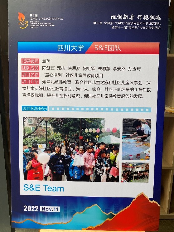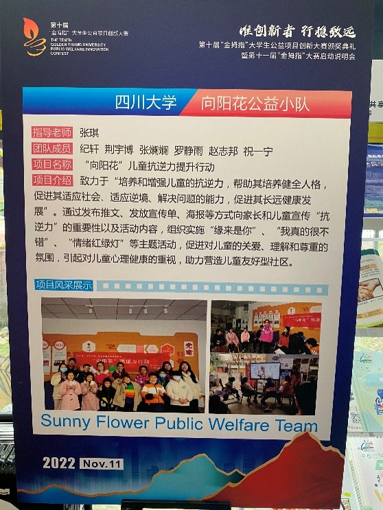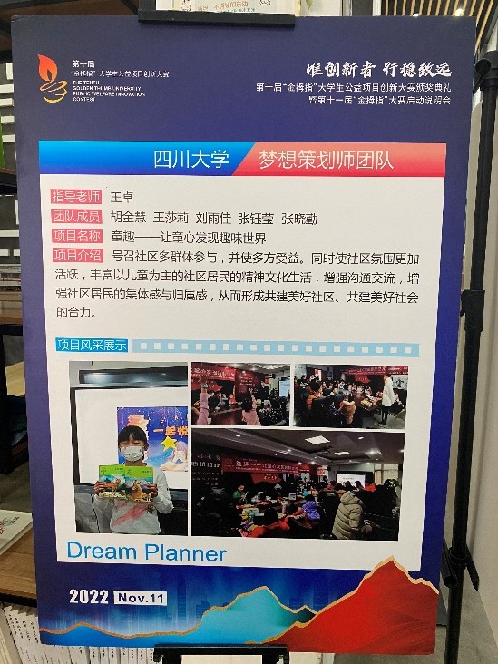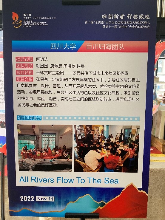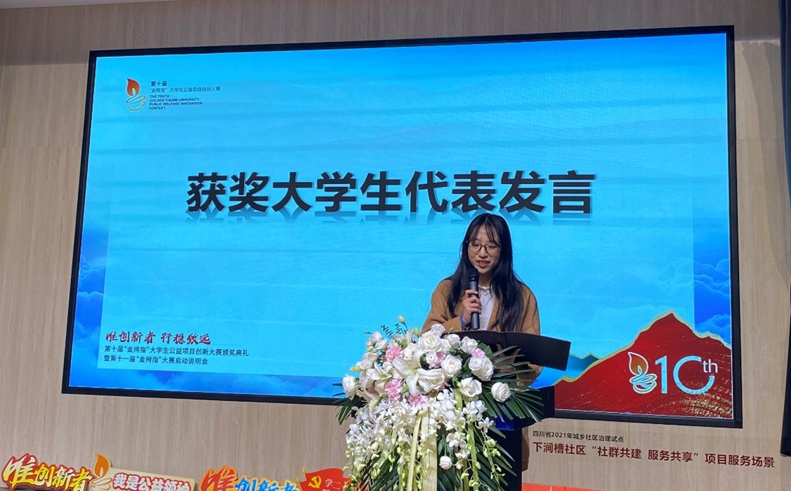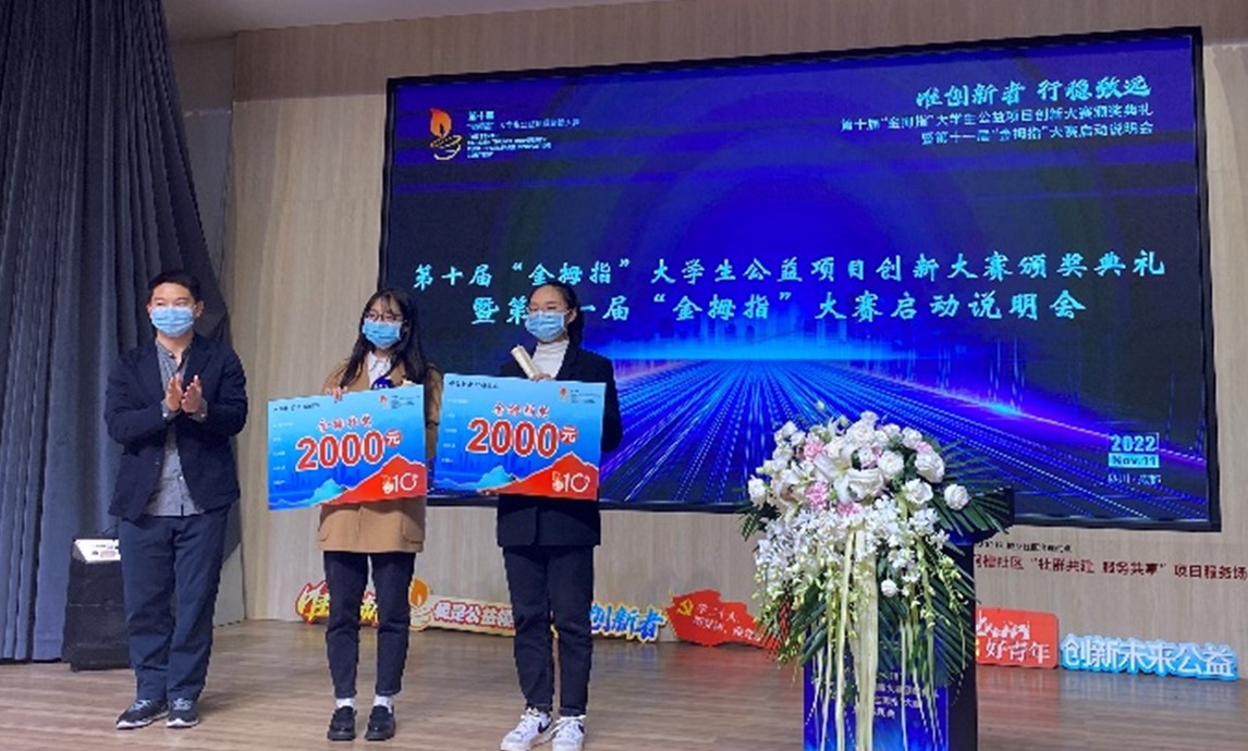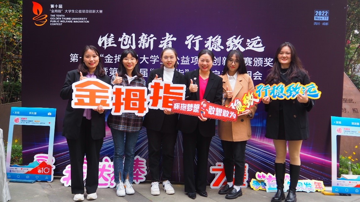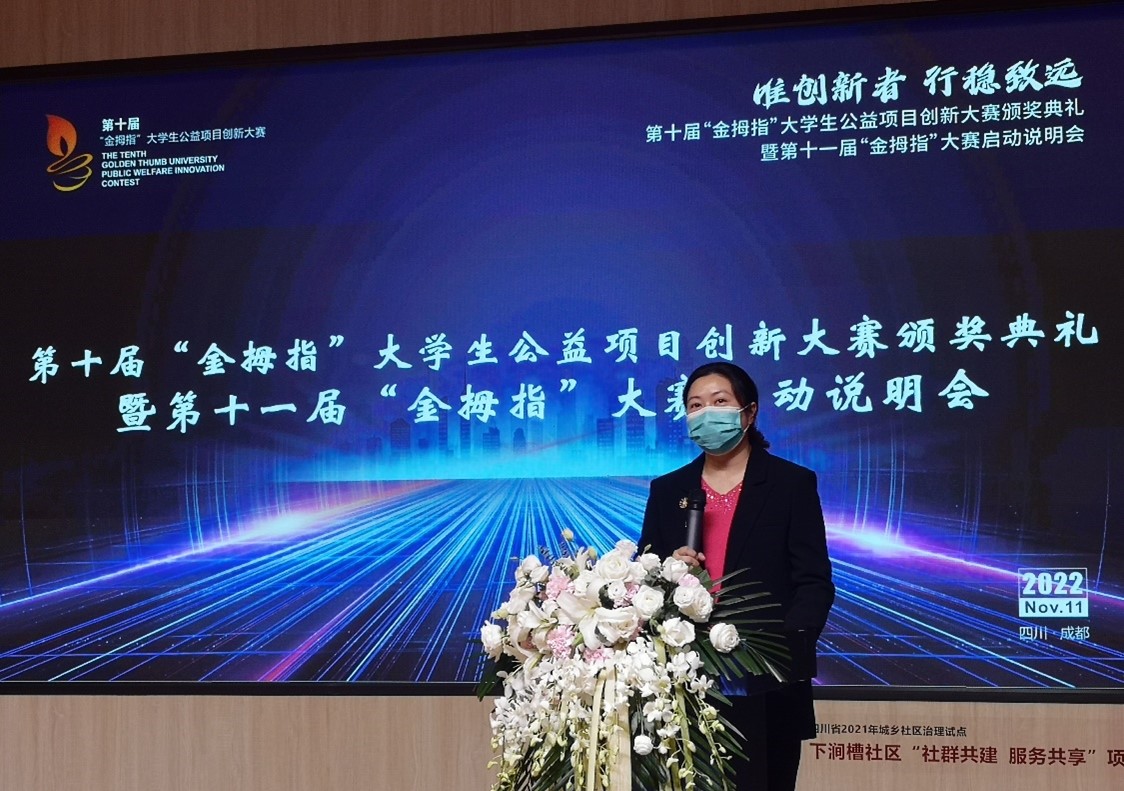 2022年11月10日下午,由成都市锦江区社会组织发展基金会举办的第十届“金拇指”大学生公益项目创新大赛颁奖典礼暨第十一届“金拇指”大赛启动说明会于成华区邻里月台顺利举行。团省委、锦基金、参赛高校师生代表出席活动。