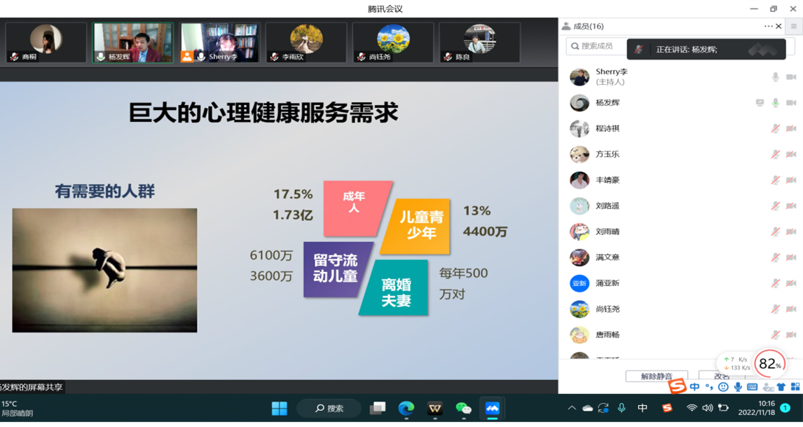 2022年11月18日,澳门太阳成集团2022级应用心理专业的发展心理学的课堂上邀请到西南大学心理学部心理咨询研究与培训中心主任、中国心理卫生协会认证首批心理督导师,国际认知行为治疗学院认证认知行为治疗师、认知行为治疗培训师(督导师)杨发辉老师给同学进行线上讲座。