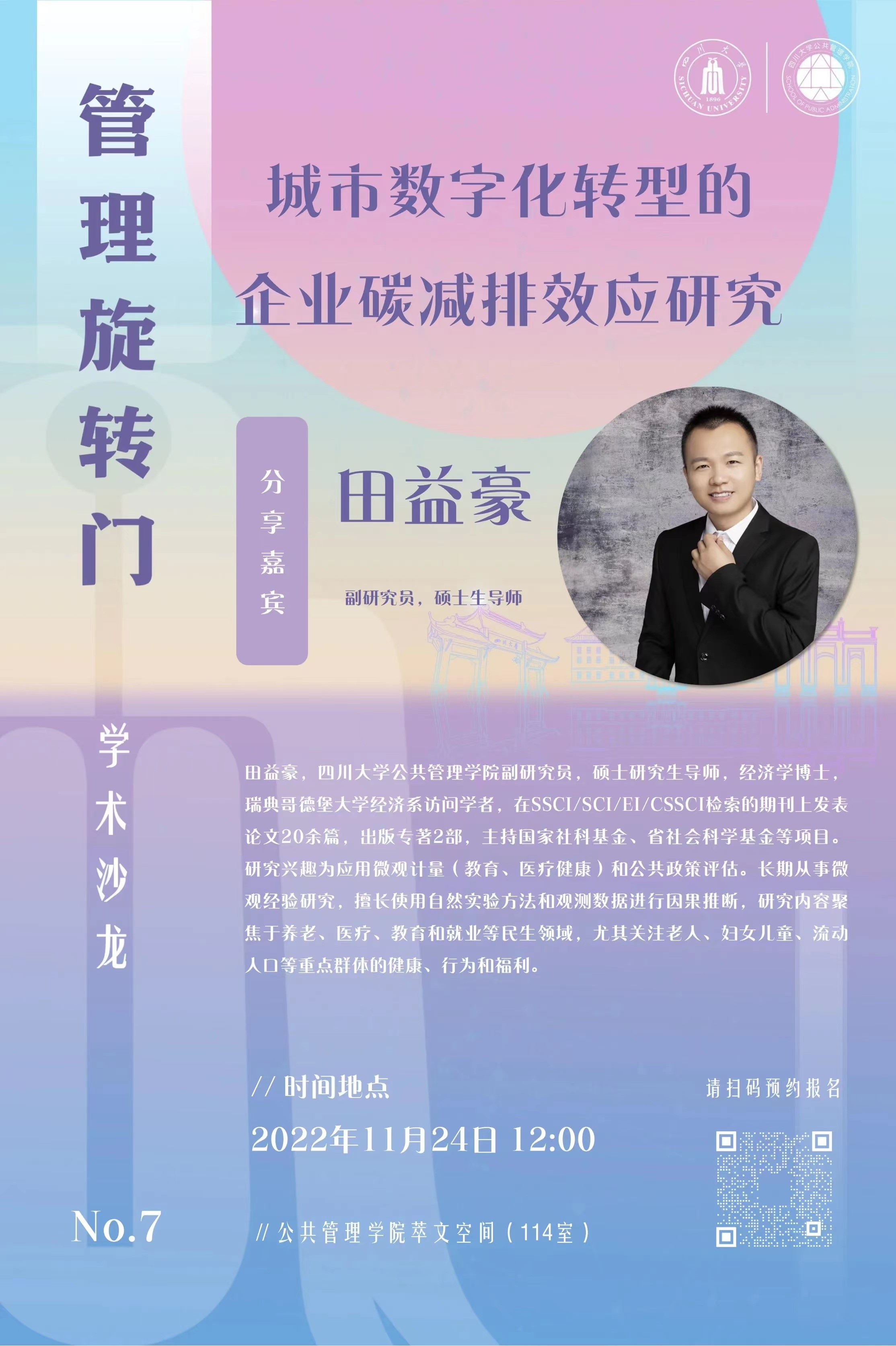 2022年11月24日,澳门太阳成集团举行第7期“管理旋转门”学术沙龙。本次沙龙特邀太阳成官网副研究员田益豪老师作为主讲嘉宾,分享题目为:“城市数字化转型的企业碳减排效应研究”。