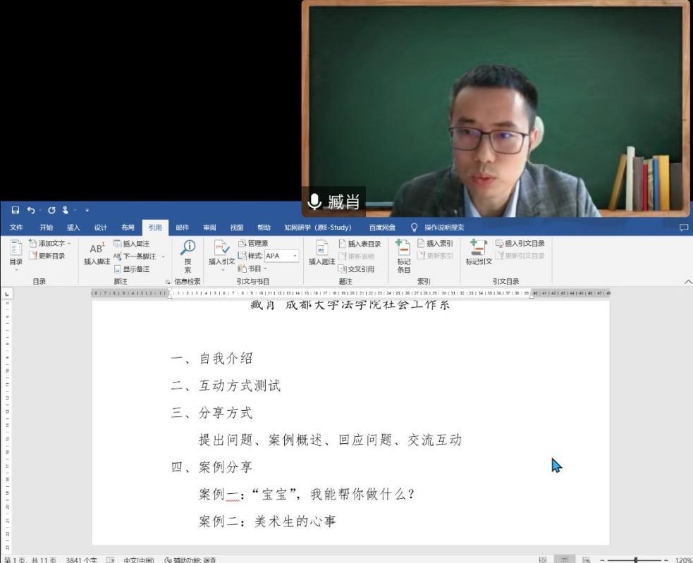 11月21日上午10:00,在望江校区东区第三教学楼406教室,社会工作课程案例教学之“儿童心理健康案例研讨会”如期举行。此次研讨会邀请了成都大学法学院社会工作系主任、社会工作师、心理咨询师臧肖副教授作为主讲嘉宾。社会学与心理学系徐婷副教授主持讨论,35位社会工作本科生参与学习。