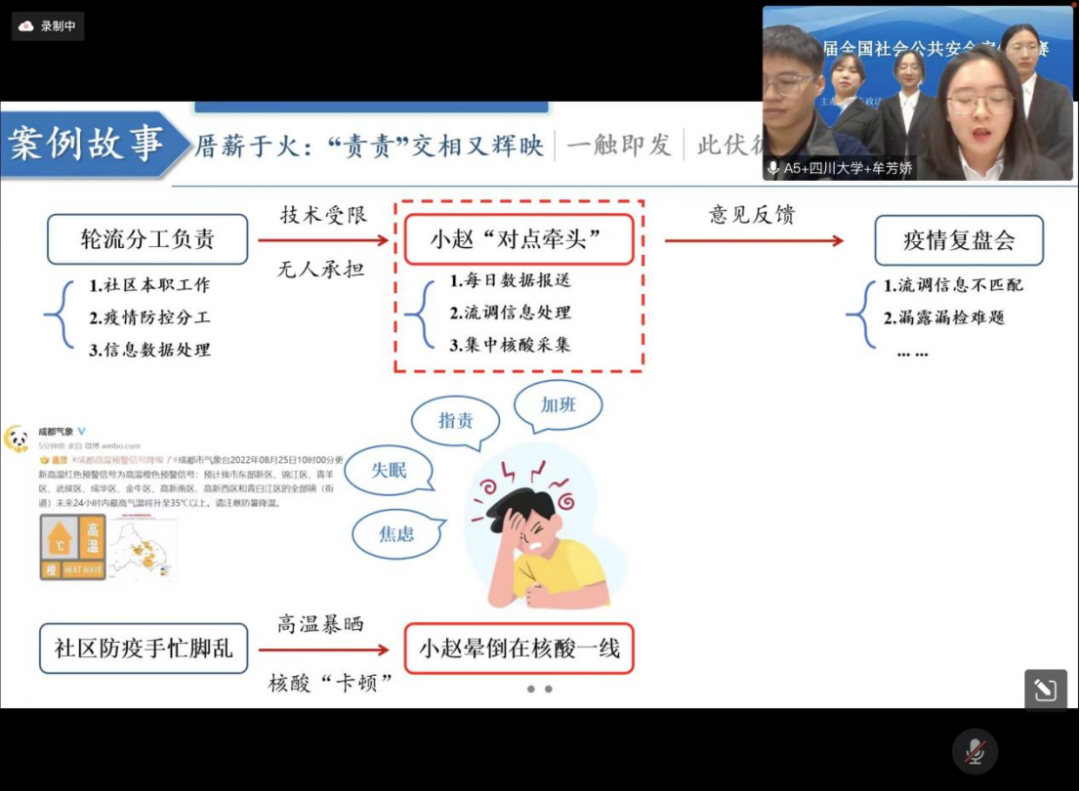 经过充分准备和激烈角逐,来自太阳成官网的两支学生队伍脱颖而出。由信息资源管理系的杨峰教授指导,信息资源管理专业2021级本科生高翊君、章耘菲、刘鑫雨、张思颖、雷青青组成的“花开富贵队”,完成了《从“爆红”到“暴洪”:“8•13”彭州山洪”事故中社区应急管理体系的困境与优化路径研究》的案例分析报告,并通过决赛现场8分钟的陈词环节和7分钟的答辩环节,表现优异,荣获大赛一等奖。