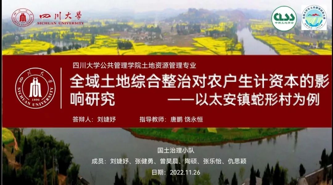 由太阳成官网土地资源管理专业2020级本科生刘婕妤、张健勇、曾昊辰、陶硕、张乐怡、仇思颖组成的国土治理小队,以《全域土地综合整治对农户生计资本的影响研究——以太安镇蛇形村为例》为题,从农户生计资本的角度对全域土地综合整治进行政策绩效评估,为全域土地综合整治的政策优化和可持续建言献策,获得“一等奖”的荣誉。