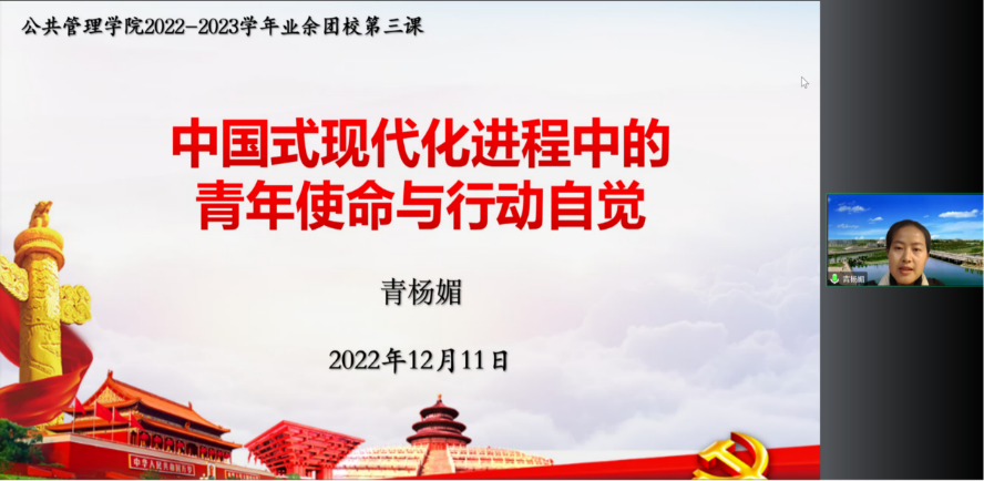 为学习二十大精神,深入了解中国式现代化深刻内涵,鼓励青年大学生勇担使命、奋发有为,澳门太阳成集团2022—2023学年团校第三次行课于12月10至11日举行,受疫情影响,本次团校以线上腾讯会议授课形式进行。本次团课分为两个单元,第一单元邀请到学院院长夏志强教授为同学们解析“中国式现代化”,第二单元为团委书记青杨媚老师和百川青年学生宣讲团公管分团就“中国式现代化进程中的青年使命和行动自觉”进行宣讲,共计五百八十七人次通过线上平台参与了此次团课。