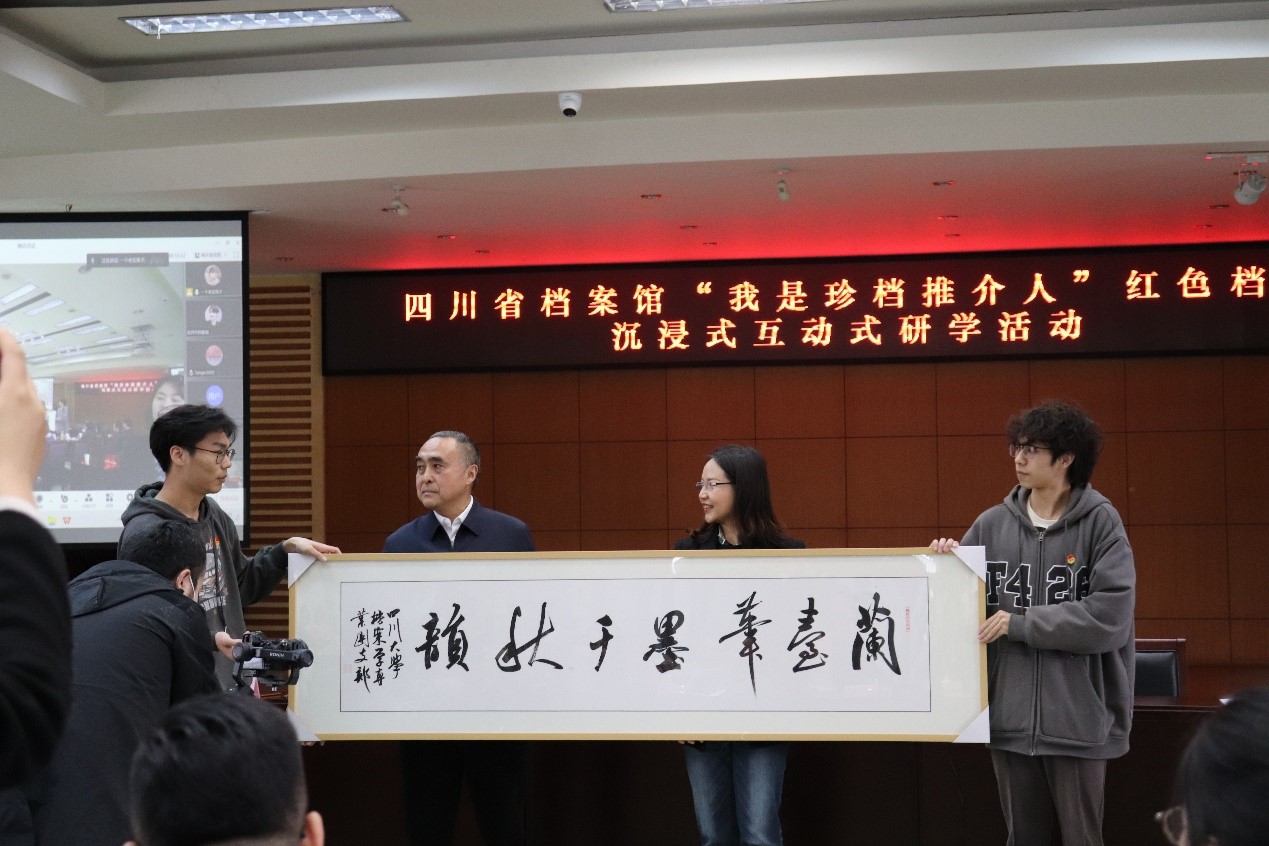 交流会的最后,档案班团支部以全体同学的名义赠送档案馆一幅书法作品——“兰台笔墨千秋韵”,“兰台”是档案管理机构的旧称,以表达对档案工作者的敬意和对四川省档案馆对本次活动支持的谢意。四川省档案馆也给澳门太阳成集团教工和互动问答环节回答正确的同学赠送了相应的文创产品。
