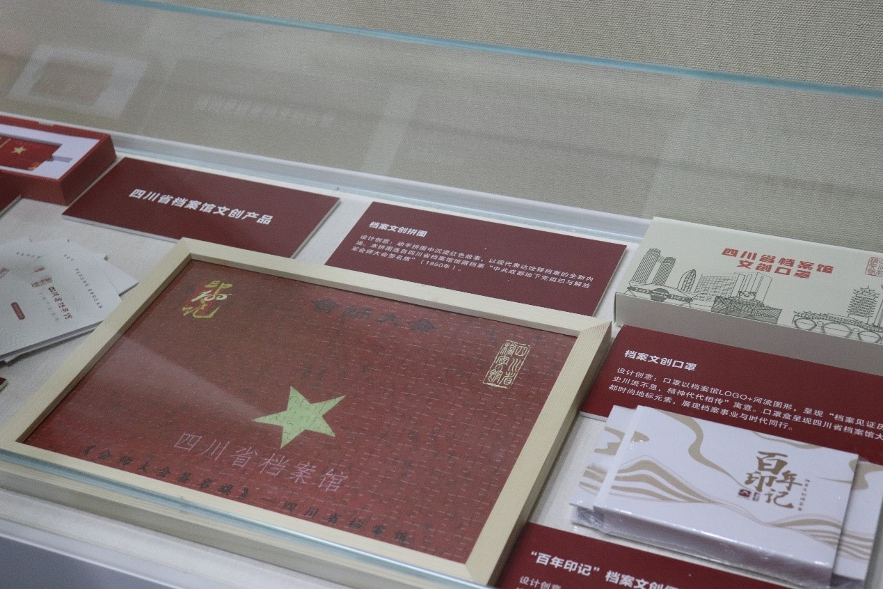 在文化产品展示展播环节,四川省档案馆展示了一批档案文化创意产品,讲解员向同学们详细介绍了四川省档案馆发布的川渝两省市档案馆在2022年国际档案日联合发布的“百年印记”文创便签、“印记100”系列文创产品、四川省档案馆文创口罩等文化产品。同学们对档案文化产品这一创新形式也有所了解,并且被精美的制作所惊叹。