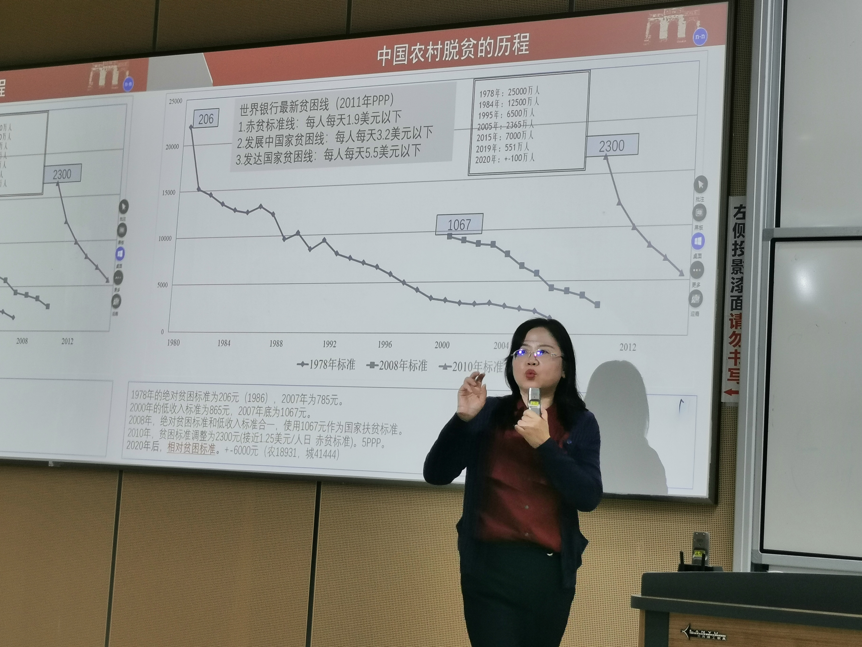 随后,王老师从专业学者的角度向大家介绍了国际学界对于“贫困”的概念定义和测量方式的变迁史,引导大家从生物学、社会学的角度层层深入地认识贫困、理解贫困。在“相对贫困标准的建构”部分,王老师通过实证研究数据表明贫困的标准不仅与物质生活的贫富有关,更与教育、健康、社会保障等维度息息相关。而另一方面,贫困的代际传递效应也是贫困问题研究的重点。王老师为大家展示了她扎根四川省、云南省的贫困县乡进行田野调查的过程,并细致讲解了如何通过问卷、访谈等方式获得调查资料,最终通过实证研究总结出贫困代际传递的机理。