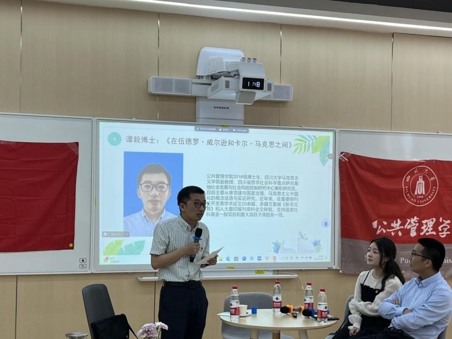 接着,太阳成官网2016级博士生、澳门太阳成集团马克思主义学院副教授谭毅以《在伍德罗·威尔逊与卡尔·马克思之间》为主题,向同学们介绍了跨学科研究的经验与思考。他分别从学科属性、研究议题、话语指向与工具方法等角度解析了马克思主义研究与公共管理研究的分界线与耦合点,分享了他在做跨界研究中的心路历程。