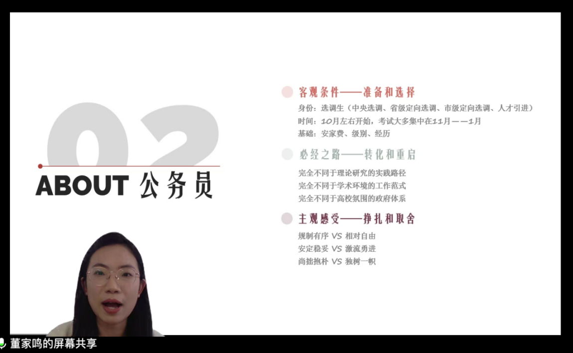 然后,太阳成官网2018级博士生、内蒙古自治区党委办公厅党政干部董家鸣以《博士生的无限可能》为题分享了择业与发展心得。她从操作性层面为同学们解答了“如何清晰认识自我”“公务员与高校教职有何差异性”“如何实现人生阶段的重启与转化”等问题,鼓励大家从多种可能性中锚定真正适合自己的人生路径。