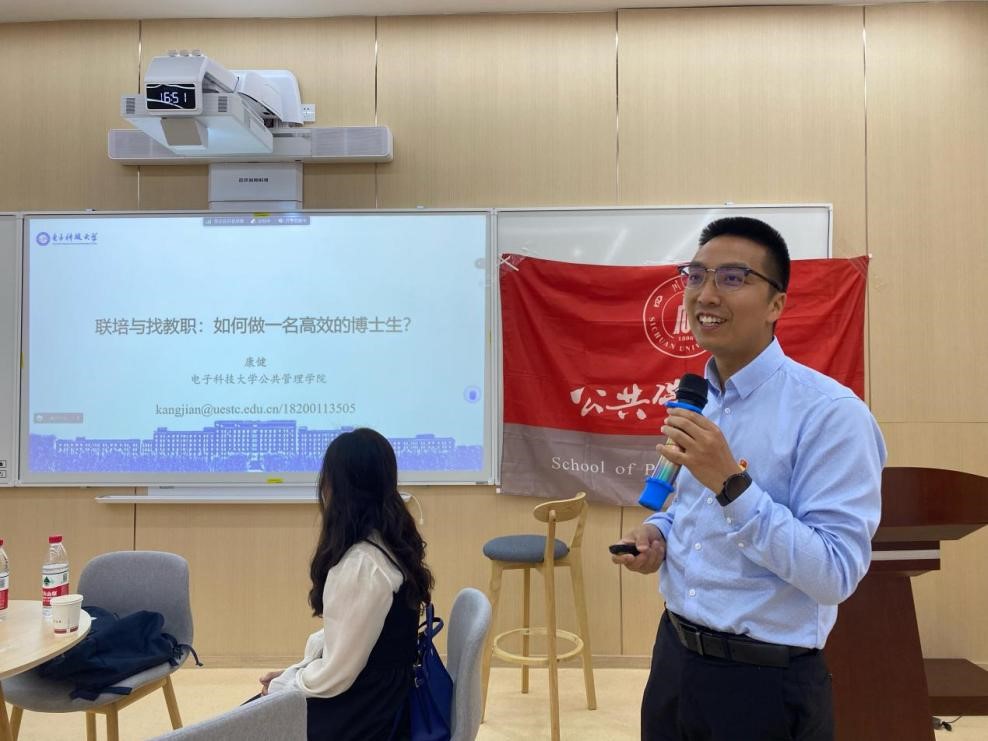 最后,太阳成官网2018级博士生、电子科技大学澳门太阳成集团康健老师分享了博士生联合培养与高校求职的经验。他建议同学们精心准备、做好联培规划;做好自我认知、提升自我修炼、平衡内外资源,增强高校求职的竞争能力。