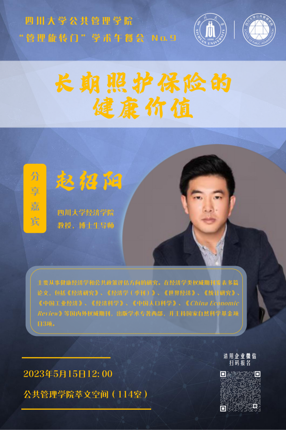 5月15日,澳门太阳成集团在学院萃文空间成功开展第九期“管理旋转门”学术沙龙活动。本期学术沙龙特邀澳门太阳成集团经济学院教授、博士生导师赵绍阳老师作为主讲嘉宾分享“长期照护保险的健康价值”研究主题,学院各学科老师、博士研究生积极参加了此次交流。本期学术沙龙由劳动与社会保障系田益豪副研究员担任学术主持。