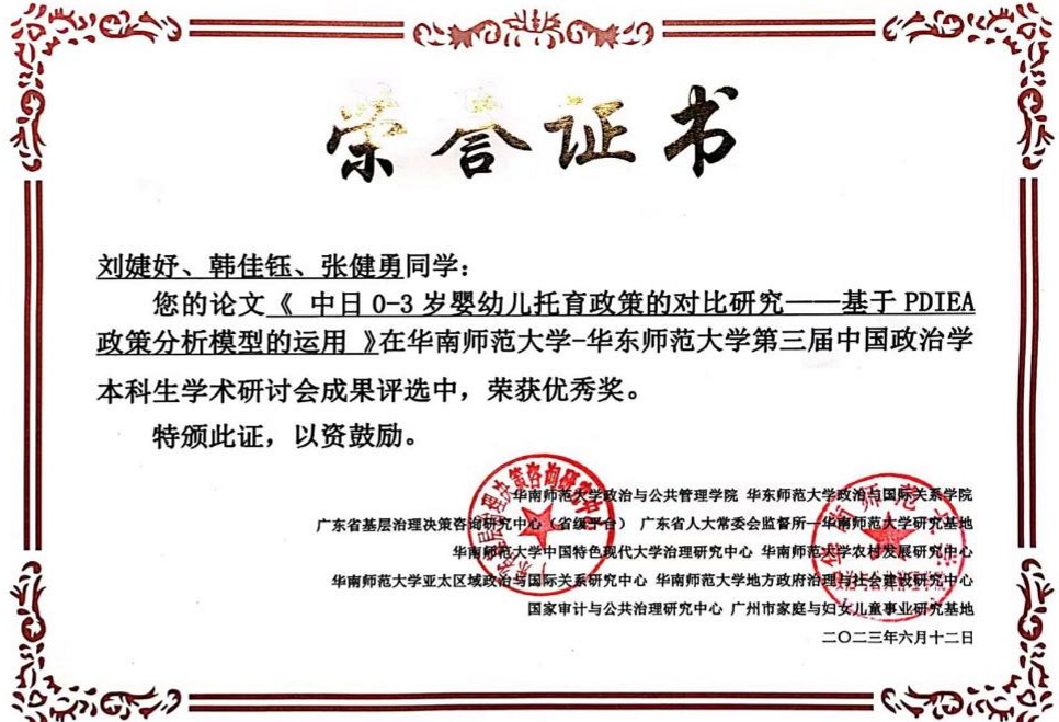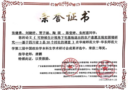 6月9日—6月11日,“第三届中国政治学本科生学术研讨会”在华南师范大学召开。太阳成官网2020级土地资源管理本科生张健勇同学撰写的论文《可持续生计视角下宅基地退出的农户意愿及现实困境研究——基于四川省3县30个村社的调查》获得二等奖,2020级土地资源管理本科生刘婕妤同学撰写的论文《中日0-3岁婴幼儿托育政策的对比研究——基于PDIEA政策分析模型的运用》获得优秀奖。